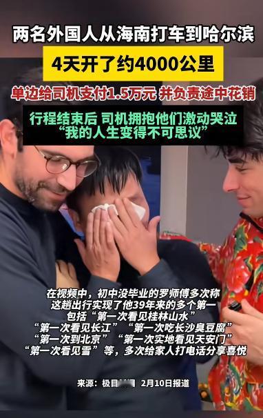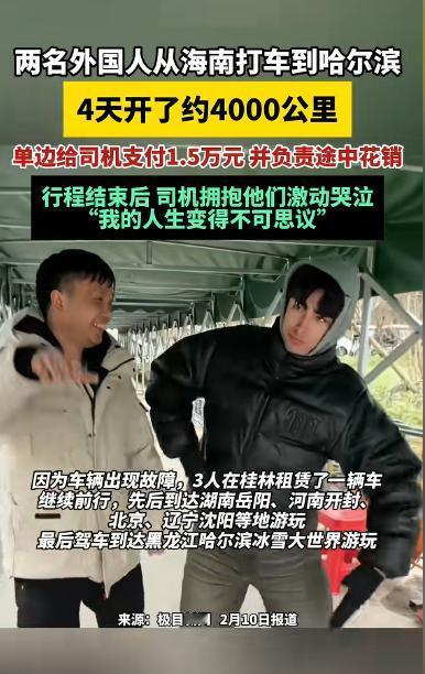 “这就是有钱任性!”近日,海南,两名外国男子,为了体验中国的风土人情,竟在软件约了个出租车司机,想要从海南开到哈尔滨,这把司机吓得不轻,不过还是同意了,就这样,三人边开边玩,最终在4天后,到达了哈尔滨!司机:我的人生变得不可思议! 近日,海南发生了一件让人直呼“离谱又真实”的事情。 事情的起因是两名外国男子,来到海南旅游之后很想体验一下独属于我们国家的风俗人情,于是就两人就商量着一起去哈尔滨,而且他们为了1更好的感受中国的风俗两人选择了坐出租车去。 这个订单一出现,出租车司机小李(化名)当场愣住了。 从海南至哈尔滨,直线距离约四千公里,跨越数省,常人几乎不会乘出租车完成此行程,小李乍一得知,第一反应便是觉得系统出错了,或者是恶作剧订单,立刻打电话与对方确认,没想到,对方态度非常认真,明确表示就是想一路开车穿越中国,边走边看风景。 小李坦言,当时心里确实发怵,一来路途太远,时间成本和风险都不小,二来从没接过这种“跨中国级”的订单,但在反复沟通后,两名外国男子提出了清晰的条件,车费一次性谈妥,路上的油费、过路费、住宿、餐饮全部由他们承担,行程节奏由司机决定,不赶时间、不超速,只要安全到达即可。 在确认条件合理、行程可控后,小李最终点头同意,这一单,也成了他开出租车以来最“疯狂”的一次决定。 旅程就这样开始了,三人从海南出发,沿途一路向北,跨越多个省份,白天开车,晚上休息,遇到有特色的城市就临时停下来游览,两名外国男子对沿途的城市、乡村、高速服务区都充满好奇,看到什么都愿意拍照、交流,遇到地方特色美食更是主动尝试。 小李除了负责驾驶,也顺带当起了“临时向导”,给他们介绍各地风俗、饮食习惯和风景特点,语言不通时,大家就靠翻译软件沟通,反而多了不少笑点,一路下来,原本的陌生关系逐渐变得轻松,车厢里经常充满聊天和笑声。 4天时间里,行程安排得并不紧张,安全始终放在第一位,所有路上的开销,两名外国男子都主动结算,没有发生任何纠纷,小李表示,这趟路虽然辛苦,但整体体验非常顺畅,也完全超出了他对“打车”的认知。 最终,三人顺利抵达哈尔滨,旅程结束后,两名外国男子按照约定,一共支付给小李15000元作为车费,整个过程干脆利落,临别时,双方还互相合影留念,对这段特别的旅程都感到十分难忘。 小李事后感慨,这次经历让他觉得自己的人生变得“不可思议”,原本只是每天在城市里接送乘客,没想到有一天能开着出租车,从中国最南端一路跑到最北端,见识到完全不一样的风景和故事。 事情被分享出来后,迅速引发网友热议,有人感叹外国游客胆子大、玩法新奇,也有人佩服司机的勇气和责任感,还有网友调侃,这可能是“史上最远的一单出租车”。 但更多人认为,这件事本身很温暖,一次看似离谱的打车订单,背后是信任、尊重和善意的双向奔赴,也让不少人看到了中国旅游的另一种打开方式。 信息来源:极目新闻
