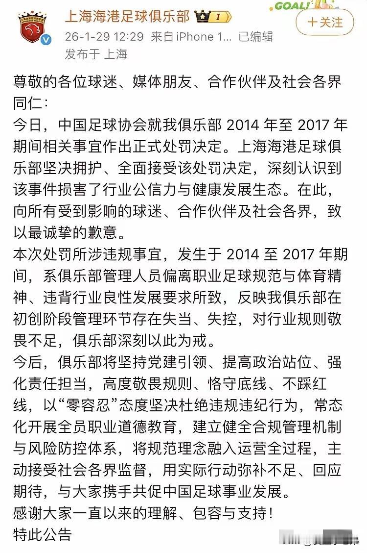 申花和海港选择认错,国安不甘回怼,究竟谁更明智? 近日,沉寂已久的中国足球再次冒出爆炸性新闻。 9家中超球队因曾经的问题被扣分。 这其中,既有老油条上海申花、天津,也有新贵上海海港、北京国安。 尤其是海港和国安,一直被大家当成行业标杆,这回真是毁三观。 不过有趣的是,几支球队随后的态度呈现两极分化。 既有认错态度诚恳,也有不甘回怼, 作为联赛冠亚军,上海两队反应迅速,态度也极为谦卑。 写了洋洋洒洒一堆,其实就一个意思:我错了,我认。以后一定改。 这哥俩非常聪明,知道木已成舟,任何解释都很苍白,不如低头。 如此一来,至少态度端正,且给足了足协面子,将影响降到最低。 典型的公关手段,不逃避、直面问题,让事情尽快过去。 说起来,久事这回比港务集团更冤,毕竟他是背锅侠。 足协相当于用前朝的剑对付本朝的官,明眼人都清楚。 但没办法,谁让久事接手呢? 既然接手,无论是荣耀还是耻辱都得通盘接受,没得挑理。 情感上可以同情,但判罚上无误。 所以,他俩的态度很明智,不跟足协过多纠缠,往后该怎么样还是怎么样。 但国安的反应就有意思多了,甚至可以说出人意料。 短短一句话,13个汉字,但信息量远超上海哥俩,让人无限遐想。 很明显,国安对判罚心有不甘,甚至认为不公平,才会如此怼回去。 不仅如此,俱乐部还召开球迷通气会,强调球队没错。 挺佩服国安,如此压力下还能硬顶,比上海哥俩有看头多了。 只是事情到这步,有些不好收场。 留给国安似乎只剩一条路,既然选择得罪足协,那就得罪到底。 为啥这么说? 因为这种事开了头,倘若做到一半偃旗息鼓,那球迷不答应,足协也不会说你好。 不如索性把事情说清楚,公布于众,让大家去评判,是非曲直自有公论。 目前的国安只选择不认错是不够的,必须把冤枉证据都拿出来,才能让人信服。 或许这会彻底跟足协撕破脸皮,但绝对能赢得所有人尊重。 国安球迷不是说了,可以选择退出,但不能蒙受不白之冤。 态度很明确,是爷们就把话说清楚,后果我们一起承担。 另外,有些球迷表示国安不服,足协怎么不拿出证据? 别指望,足协联合公安部做出处罚,有国家执法部门背书,还不够? 国安除了自证清白,别无他法。 说实话,国安这么做不太明智,会把事情越弄越大,不利于未来发展。 当然,真打算为了清白不惜一切代价,那就另当别论。 最怕国安一怒之下,怒了一下,那就把自己整成了笑话。 所以,路是自己选的,跪着也要走完。