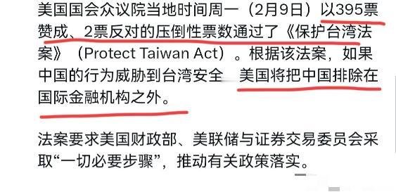美国完全没有把我们的警告听进去,美国做了一个硬动作声称,如果中国的行为威胁到台湾安全,美国将把中国排除在国际金融机构之外。2月9日,美国国会众议院以395票赞成、2票反对的压倒性票数通过了《保护台湾法案》。根据该法案,如果中国的行为威胁到台湾安全,美国将把中国排除在国际金融机构之外。 按照美国立法程序,该法案在众议院通过后将送交参议院审议,若获得通过,再由美国总统签署后方可生效。 很显然,我们刚警告美国必须慎重处理台湾问题,但是美国方面看起来完全没有把我们的警告当一回事。 如此明目张胆地以国内法妄图干涉中国内政,美国的用心极为险恶,这无疑是对“台独”分子发出了极为错误的信号。 从法案本身来看,美国试图把台海问题和国际金融体系绑定,用金融制裁作为威胁工具,本质上是把国内法凌驾于国际法和国际关系基本准则之上。 台湾是中国不可分割的一部分,台湾问题纯属中国内政,这是国际社会公认的事实,也是中美三个联合公报明确确立的原则。 美国没有任何资格、没有任何权利,对中国处理台湾问题的方式说三道四,更不能用立法手段为干涉中国内政找借口。 美国国会推出这样的法案,不是为了所谓“保护台湾”,而是为了推进“以台制华”的战略,把台湾当作遏制中国发展的棋子,这一点明眼人都能看得清清楚楚。 很多人会疑惑,美国把中国排除出国际金融机构,真的能做到吗?其实答案很明确:做不到,也行不通。 第一,国际金融机构不是美国的“私人工具”,像G20、国际清算银行、金融稳定委员会等机构,都是由多个国家共同参与、共同治理的国际平台,决策需要遵循多边规则,不是美国一家说了算。 中国是全球第二大经济体,是全球产业链供应链的重要环节,也是诸多国际金融机构的重要参与者,中国的地位和作用是由世界经济格局决定的,不是美国一纸法案就能否定的。 第二,美国近年来频繁用金融手段打压他国,早已透支自身信用,全球不少国家都在推进去美元化、多元化的金融布局,美国再想用单边制裁胁迫国际社会跟风,只会越来越力不从心。 从台海局势的角度来说,美国这一法案只会起到火上浇油的作用。 一方面,“台独”分裂势力会误以为有美国撑腰,更加肆无忌惮地推进分裂行径,不断挑战一个中国原则,破坏台海和平稳定的根基。 另一方面,美国不断虚化、掏空一个中国原则,持续在台海问题上挑衅,只会严重冲击中美关系的政治基础,让两国之间的信任进一步流失。 事实上,岛内不少民众和舆论也看得明白,美国所谓的“保护”不过是口头承诺和政治表演,真到关键时刻,美国不会为了“台独”势力付出实质性代价,所谓金融威胁,更像是“打肿脸充胖子”,既挡不住中国统一的历史大势,也保护不了一心搞分裂的“台独”分子。 中方在台湾问题上的立场一以贯之、坚定不移。我们始终坚持以最大诚意、尽最大努力争取和平统一的前景,但绝不允许任何外部势力干涉中国内政,绝不允许“台独”分裂势力以任何方式把台湾从中国分裂出去。 面对美国的挑衅和威胁,我们不会有丝毫退让,也不会被任何威胁吓倒。中国有足够的能力、足够的底气,捍卫国家主权和领土完整,有能力挫败任何形式的“以台制华”图谋和“台独”分裂行径。 美国应该清醒认识到,台湾问题是中国核心利益中的核心,是中美关系不可逾越的红线。 无视中方警告、执意推进涉台消极法案,只会让中美关系面临更大风险,只会让台海局势更加紧张。 中国人民捍卫国家领土完整的决心和意志,坚如磐石、不可撼动。任何逆历史潮流而动、干涉中国内政的行为,最终都必将以失败告终,也必然会付出应有的代价。 信息来源 1. 美国国会众议院官网(2026年2月9日投票结果公告) 2. 中华人民共和国外交部例行记者会(涉台问题官方表态) 3. 新华社、人民网、环球网(美国涉台法案权威报道)