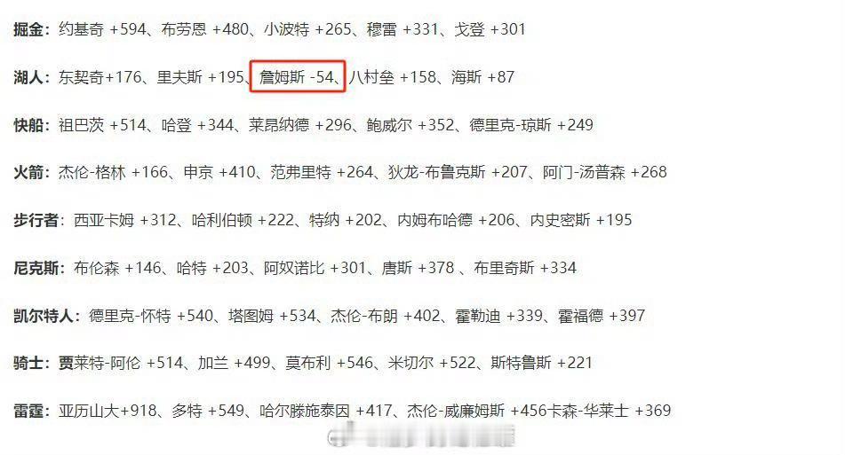烫知识:上赛季詹姆斯不仅是所有入选最佳阵容中唯一的正负值为负的球员(-57),也是50胜球队的首发正负值唯一为负的球员。