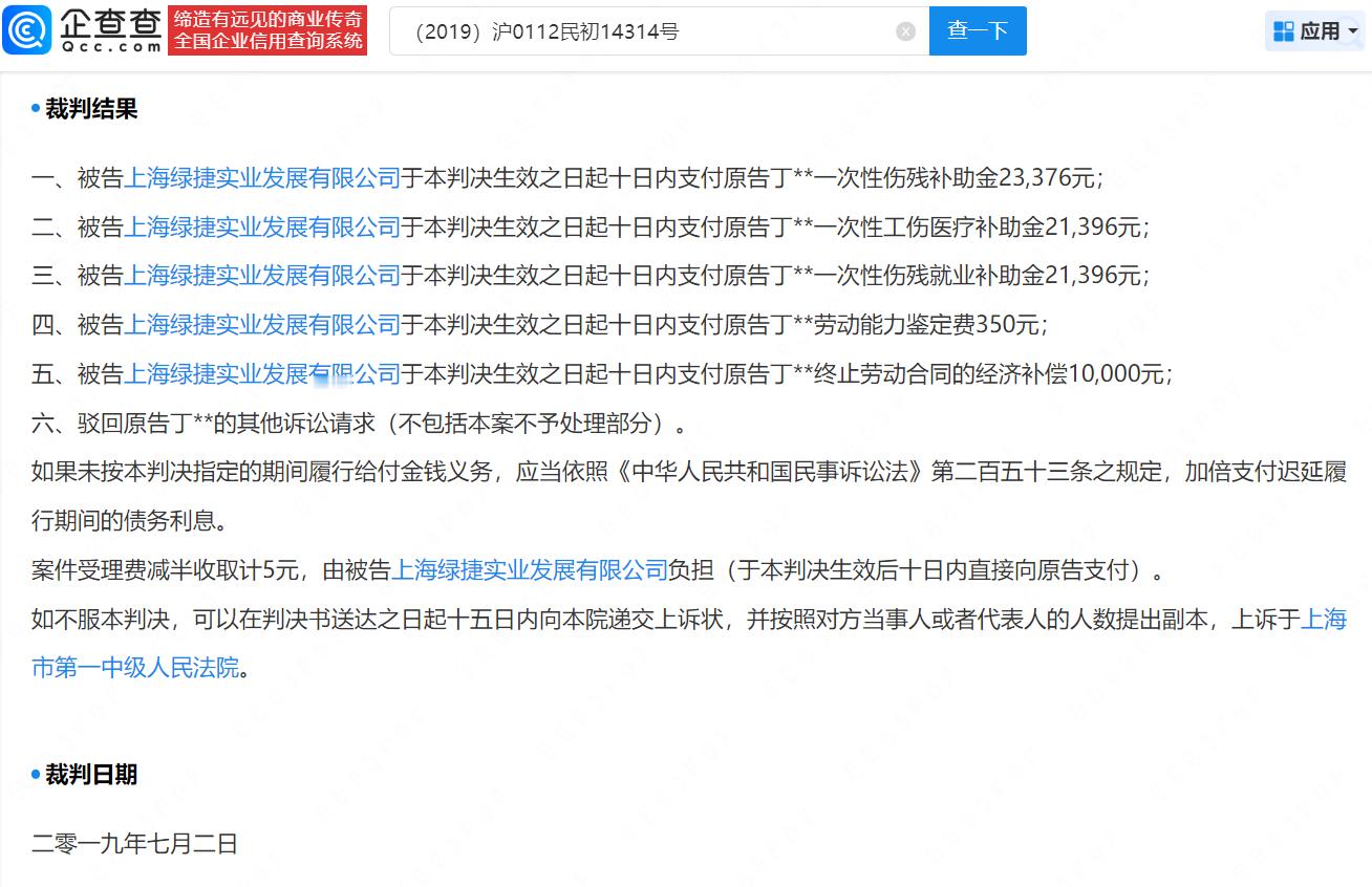 【上海绿捷被执行7.4万,涉保洁工伤赔偿纠纷】