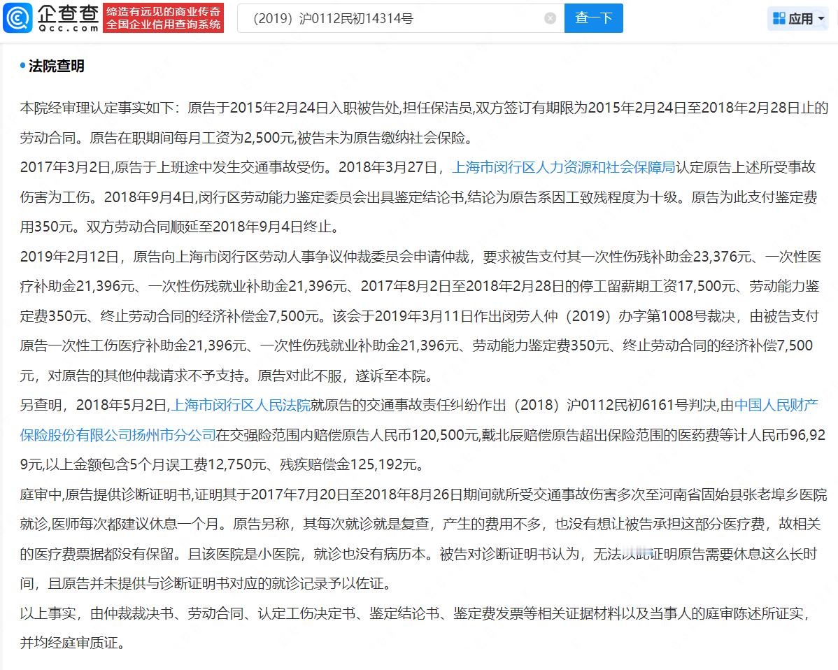 企查查APP显示,近日,上海绿捷实业发展有限公司新增一则被执行信息,执行标的7.4万余元,执行法院为上海市闵行区人民法院,涉及与员工丁某的劳动合同纠纷。2017年3月,该公司保洁员丁某在上班途中遭遇交通事故,经鉴定为因工致残程度十级,丁某起诉要求公司支付一次性伤残补助金、工伤医疗补助金、伤残就业补助金、停工留薪期工资、经济补偿金等共计10.9万余元。公司辩称丁某已从交通事故第三方获赔残疾赔偿金及5个月误工费,不应再重复主张一次性伤残补助金与停工留薪期工资;对其增加的经济补偿金金额亦不认可,要求按仲裁裁决履行。2019年法院判决上海绿捷需支付丁某各项费用合计7.65万余元,并驳回原告其他诉讼请求。