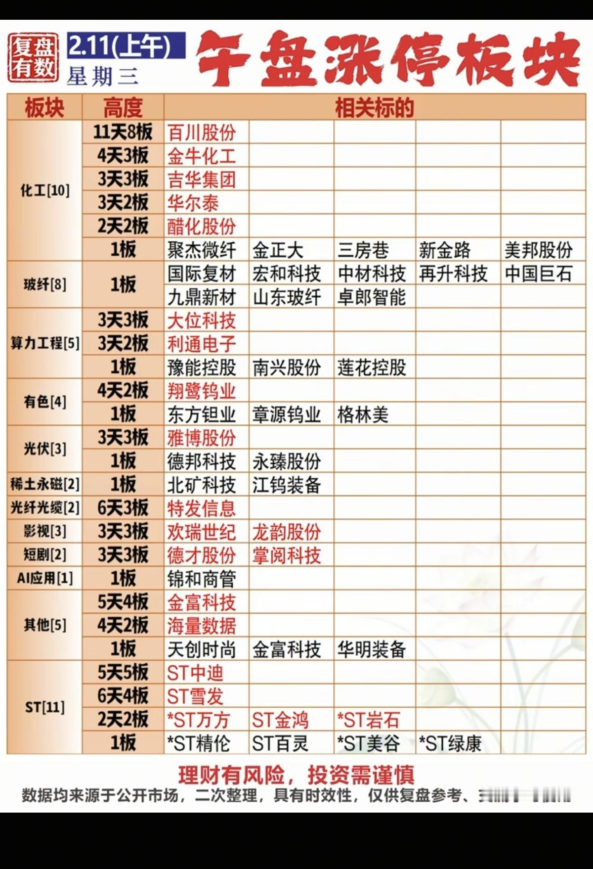 2.11周三 涨停板股票:题材+高度! 化工原料 10股涨停 玻璃玻纤 8股涨停 算力工程 5股涨停 有色金属 4股涨停 光伏 3股涨停