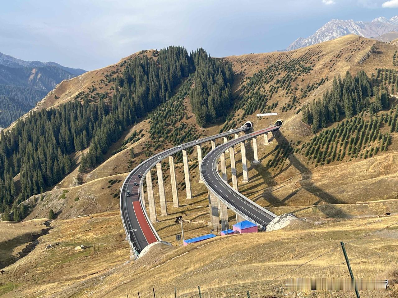 在新疆伊犁的果子沟,一座大桥如银龙般蜿蜒在群山之间。它是果子沟大桥,用巨大的桥墩托举着公路,在金黄的草坡与墨绿的云杉间划出优美的弧线,一头扎进隧道,一头通向远方。 车辆在桥上穿梭,仿佛在天地间的琴弦上弹奏。远处雪山皑皑,近处松涛阵阵,这座“中国最土豪的大桥”,不仅是工程的奇迹,更是人与自然和谐共生的壮美诗篇。