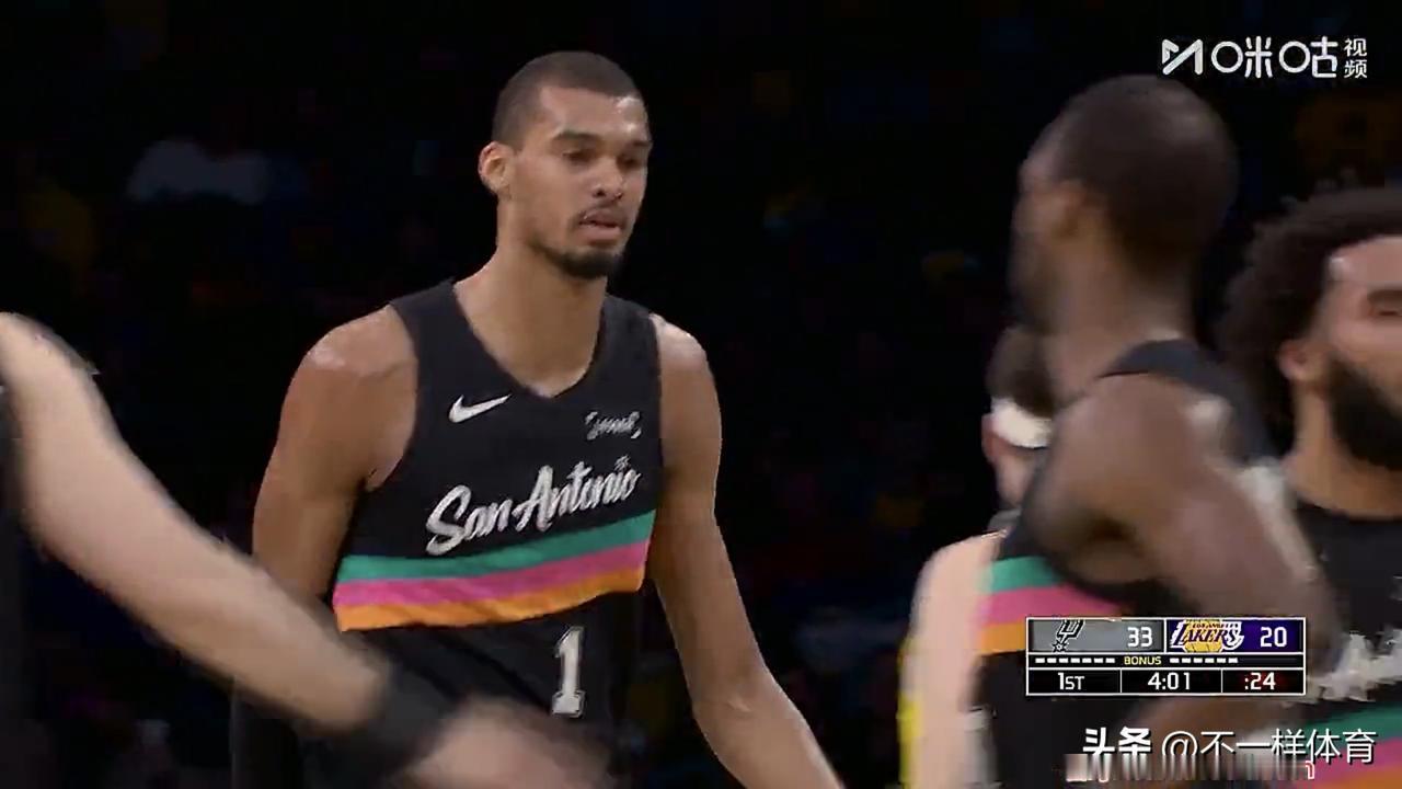 文班亚马杀疯了,第一节单节出场8分钟9中8,独得25分,比湖人队全队都多! 今天马刺队客场挑战背靠背的湖人队,湖人队轮休了全部主力,残阵的湖人队根本防不住文班亚马的冲击,第一节文班亚马出场8分钟三分球4中3,两分球5中5,罚球8中6,得到25分3篮板1抢断1封盖,防不胜防。