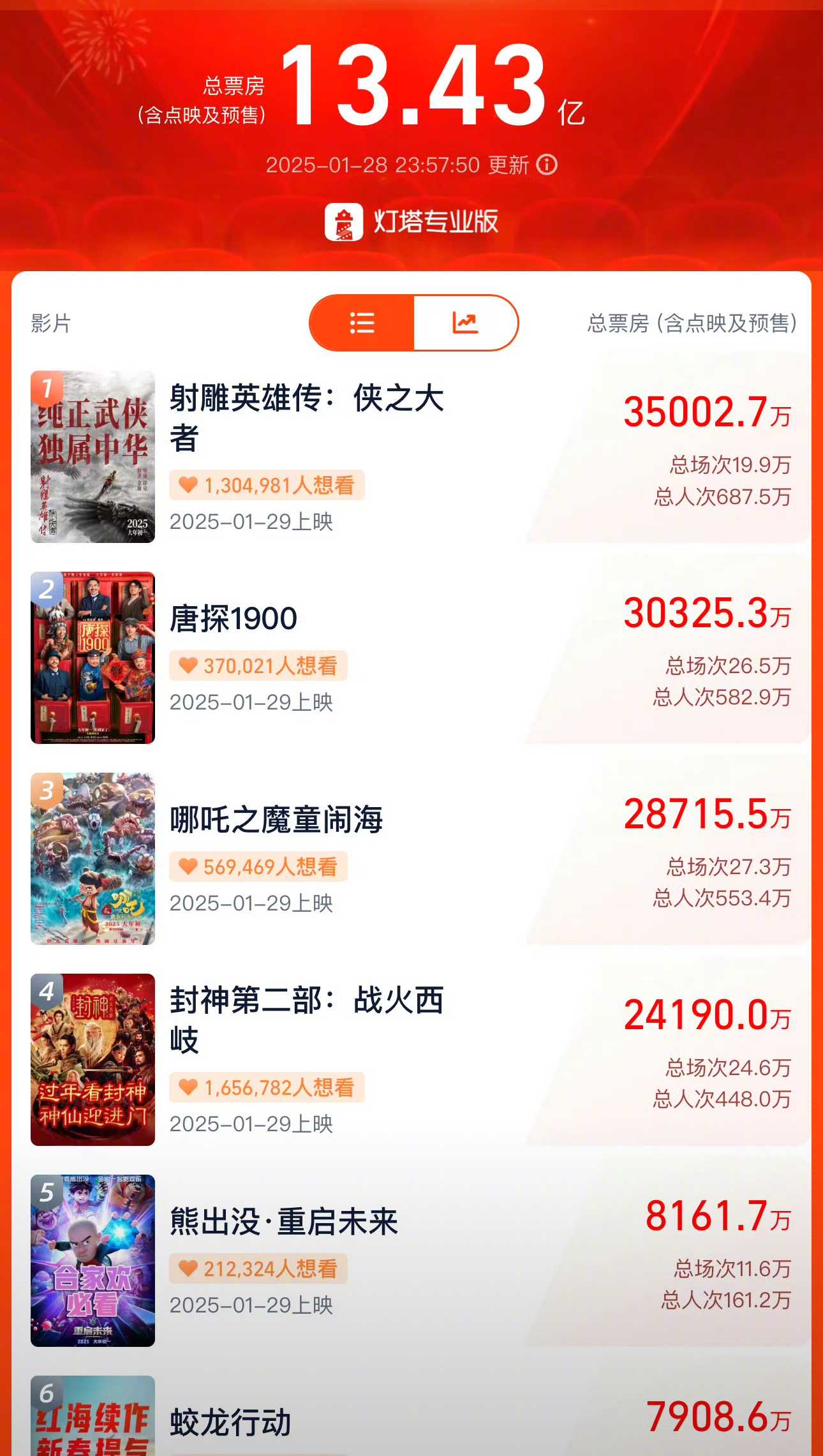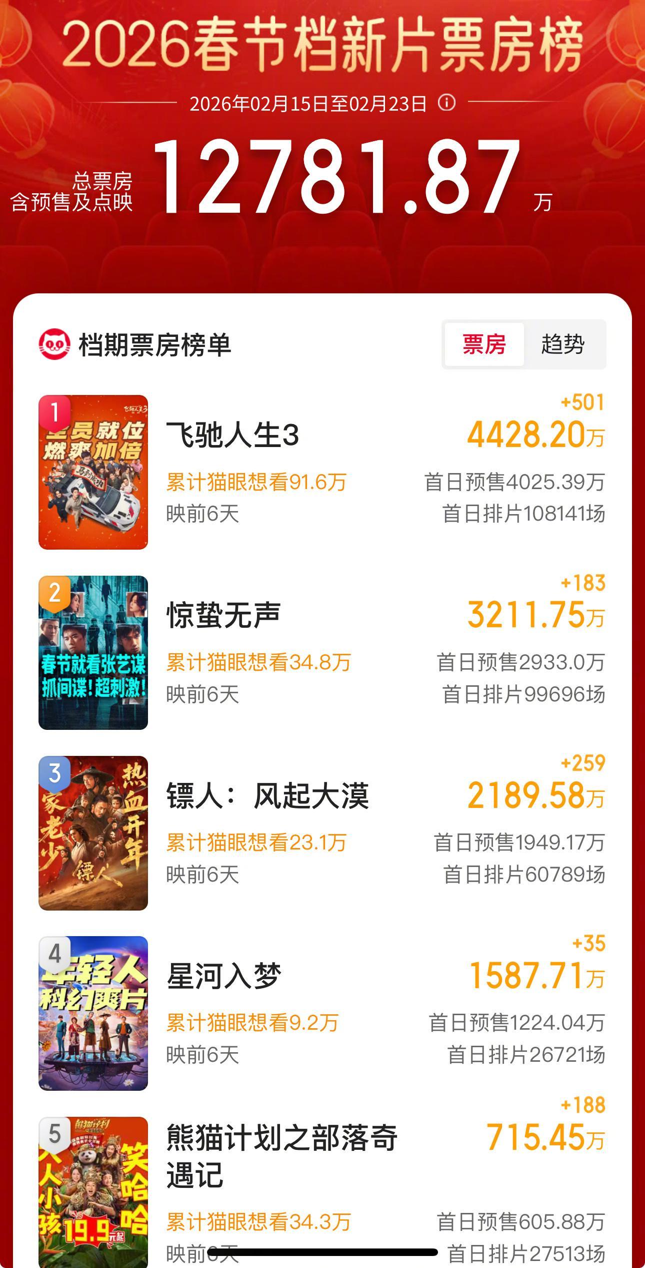 去年春节档电影射雕英雄传侠之大者 预售3.5亿,虽说预售成绩好不代表最终一定卖得好,但也能反映映前电影市场的火热程度,多少能带动一些大盘,今年的春节档对比起来相对冷清一些,希望后续能坚挺起来吧。