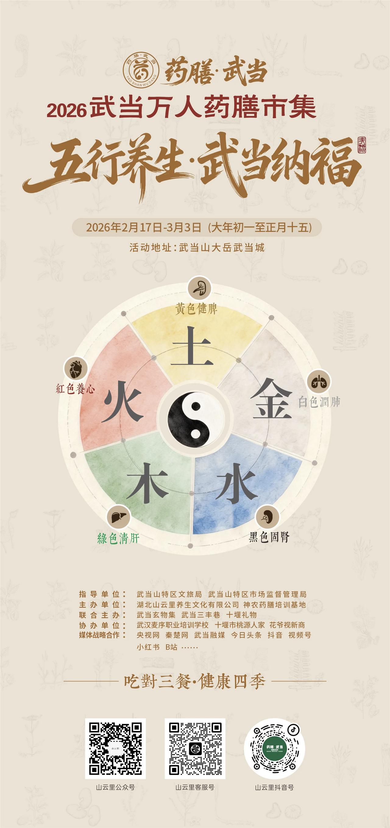 武当有请! 首届万人药膳市集重磅来袭 新春康养顶流盛宴燃爆武当! 新春登仙山,养生正当时! 2026马年春节,武当山特区首届万人药膳养生市集盛大启幕! 由湖北山云里养生文化有限公司匠心主办,年度硬核口号燃炸出圈: 药膳武当,要上武当! 活动时间:2月17日(正月初一)—3月3日(正月十五) 活动地点:大岳武当城 一站式解锁「品、学、养、游、购」全能康养打卡地,新春养生直接拉满! 道地珍材、五行药膳、养生茶饮、特色食疗齐聚,一口尝尽道家药食同源精髓! 太极养生、道家导引、传统理疗、体质咨询全覆盖,沉浸式体验武当康养绝学,边玩边养超惬意! 五行手作、古法香囊、仙侠旅拍、新春纳福轮番上线,年味与养生双向奔赴,喜庆又养身! 此次市集是武当文旅康养转型重磅力作,倾力打造「药膳武当」超级IP,激活新春文旅消费,助力国家级康养示范区建设! 这个新年,不赶热闹只养身心! 共赴武当仙山,畅享康养盛宴! 药膳武当,要上武当! 上联:酒,喝酒,喝喜酒,求下联