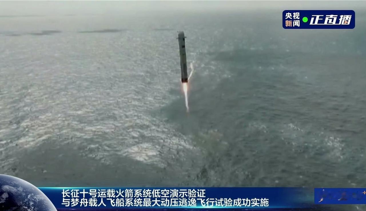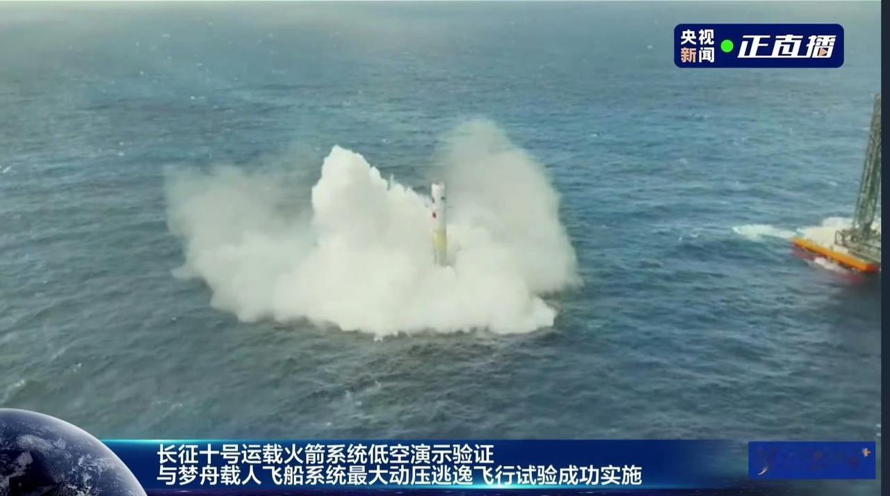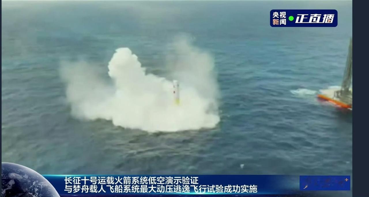 央视直播画面,长征十号甲实验箭溅落画面,网系回收船就在旁边预定位置,距离很近。 实验一次成功