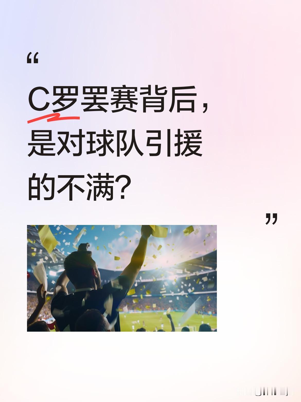 C罗罢赛背后,是对球队引援的不满? 据报道,C罗将继续缺席球队周五比赛。他并非因伤或与管理层有矛盾,而是对沙特公共投资基金管理部分俱乐部的情况不满。此前有消息称,他看到隔壁球队接连引进内马尔、本泽马等球星,自己却未能帮助球队夺冠,因此选择罢赛。当初他以高薪加盟时,曾获得专机、豪宅等特殊待遇。大家觉得,球星对球队引援不满就该罢赛吗?