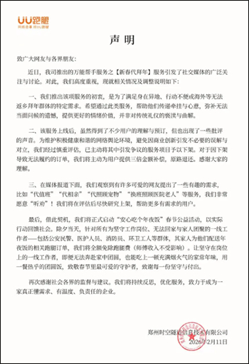 【#UU跑腿对下单代磕头顾客三倍补偿#】2月11日,微信公众号“UU跑腿”发布关于代拜年服务的情况说明,全文如下: