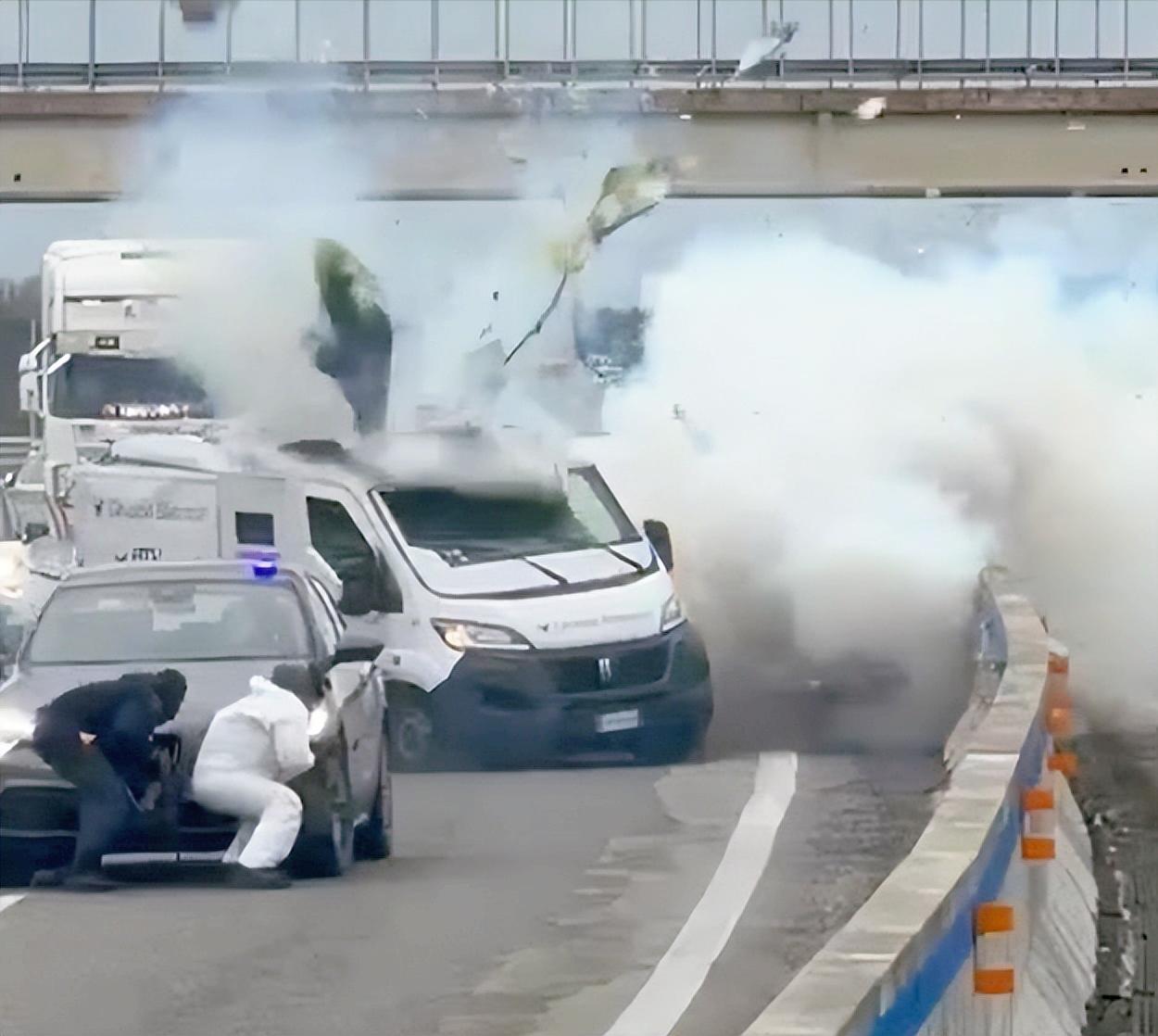 太吓人了!意大利一条高速上上演了一场比电影还刺激的劫钞大戏,8到10个蒙面劫匪,伪装成警察设埋伏,拿炸药炸运钞车,还跟警察真枪实弹干起来,结果让人笑喷了。 这帮劫匪是真的敢干,而且计划得特别周密,一看就不是第一次作案,劫匪们先找了一辆货车,直接横堵在高速正中间,点上火烧了起来,还在路面上撒了一堆钢钉,把整条路封得严严实实。 他们这么做就是为了逼停一辆运钞车,果不其然运钞车看到前面有火障,还有钢钉,根本没法走,只能乖乖停下,车一停,蒙面劫匪就跟疯了一样冲上去,手里拿着枪往运钞车上乱射,还扔了烟雾弹,把现场搞得灰蒙蒙的看不清情况。 不料射了半天,车门没打开,劫匪们更急了,直接拿出了炸药,他们把炸药贴在运钞车的车门和保险柜上,一按开关,“轰隆”一声巨响,火光直接冲天,浓烟把运钞车整个裹住了。 路过的车主用行车记录仪拍下了这一幕,从视频里能看到,运钞车的车体被炸得稀烂,到处都是破损的痕迹,但里面的保险柜却异常结实,硬是没被炸开。 就在劫匪们准备再炸一次的时候,意大利宪兵接到报警后火速赶到现场,两边当场就干上了,枪声噼里啪啦响个不停,跟打仗一样,有一辆警车还被劫匪打中了,好在没人受伤。 劫匪们本来就没炸开保险柜,又被宪兵围着打,越打越慌,知道这次肯定抢不成了,只能赶紧跑路,跑路的时候,他们还抢了路过老百姓的车当逃跑工具,不过警方反应也快,当场抓住了两个的劫匪,剩下的人趁乱逃了。 据说这帮劫匪大概率是来自意大利福贾地区的,那里有不少专门抢运钞车的犯罪团伙,特别嚣张,目前调查还在慢慢推进。 说起来也挺搞笑,这帮劫匪又是炸车又是枪战,冒了这么大的险,最后一分钱没拿到,还被抓了两个,简直是赔本赚吆喝,好在这次没人丧命,也算是不幸中的万幸了。