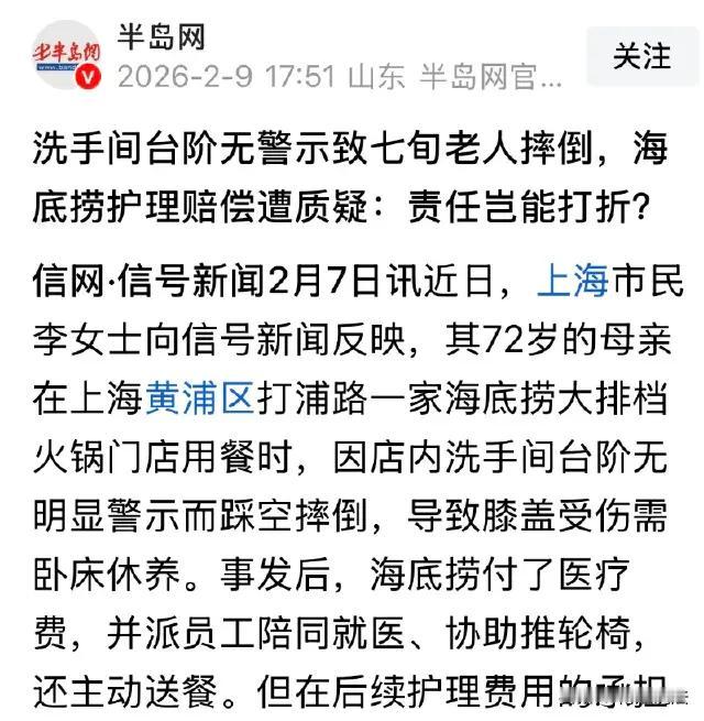 上海,女子带着一家人去吃火锅,之后72岁的妈妈独自去洗手间,很久都没有回来。女子去厕所寻找,却发现母亲倒在地上一动不动,一问才知道,老人家刚刚一脚踩空摔倒了。女子再看看台阶、跟地面铺设的瓷砖,完全一模一样,因为视觉差很容易就会以为,脚底下没有台阶,所以一脚踩下去就摔倒。事后女子母亲治疗、卧病在床,加上看护费一共8000元,火锅店却只肯赔偿2000元,女子肯定不愿意。 这件事发生在上海,繁华都市的一个普通火锅店,却牵出了一个让人愤怒又心酸的故事。72岁的母亲,只是去洗手间,却因为设计疏忽,一脚踩空,摔倒在地。那一刻,她的家人还沉浸在温馨的聚餐氛围里,谁能想到,突如其来的意外,会让幸福瞬间破碎。 女子带着一家人吃火锅,本来是想给母亲一个温暖的家庭聚会。可当母亲久久没有回来,她的心就开始揪起来。走进洗手间的一瞬间,看到母亲倒在地上,她的心几乎要跳出来。更让人后怕的是,摔倒的原因竟然是台阶和地面铺设的瓷砖完全一样,没有任何警示、没有任何视觉提示。对于年长的老人来说,这样的设计简直就是“陷阱”! 女子的母亲不仅要接受治疗,还需要长期卧床、请人看护。这一切,给家庭带来了沉重的经济压力。8000元的医疗和看护费用,对普通家庭来说,绝不是小数目。而火锅店却只肯赔偿2000元,理由是“店里已经尽到提醒义务”,让人无语。试问,如果店里真的尽到了提醒义务,为什么连基本的安全设计都没有做到?为什么连一块警示牌都没有?难道老人摔倒,只能怪自己“眼花”吗? 这件事在网上曝光后,网友们炸锅了。有人愤怒:“这不是设计疏忽,是安全责任的缺失!”有人吐槽:“赔偿2000元,是在侮辱受害者!”还有人深刻反思:“我们到底有没有真正关心老人?有没有为他们的安全着想?” 这不仅仅是一起火锅店的意外,更是对整个社会的拷问。我们常说要关爱老人,要尊重长辈,可在现实生活中,很多公共场所的设计却完全忽视了老人的需求。无障碍设施只是摆设,警示标志形同虚设。老人摔倒了,商家推责任,家属维权难,最后受伤的还是普通人。 透过这件事,我们看到的不只是一个家庭的悲剧,更是整个社会在安全责任上的缺位。火锅店的态度,是冷漠的缩影。商家只顾成本,忽略安全;消费者维权艰难,法律保护不力。这样的现实,让人心痛,也让人愤怒。 但我们不能只停留在吐槽和愤怒,更要看到改变的希望。正是女子的坚持,让事件被曝光,让更多人关注老人安全。她没有选择沉默,而是勇敢站出来,争取应有的赔偿和尊重。这种坚持,是对母亲的爱,更是对社会的呼唤。 这件事提醒我们:安全设计不是可有可无的“装饰”,而是每一个商家必须履行的责任。尤其是面对老人、孩子这些弱势群体,更要用心去做。一个不起眼的台阶、一块普通的瓷砖,可能就是一场灾难的导火索。我们不能让“疏忽”成为借口,更不能让“冷漠”成为常态。 对于火锅店来说,2000元的赔偿远远不够。更重要的是,他们必须反思自己的安全管理,必须给受害者一个交代。对于社会来说,每一个公共场所都应该以人为本,真正做到无障碍、安全提示到位。只有这样,老人才能安心出行,家庭才能放心消费。 也许有人会说,意外难以避免。但我们必须明白,很多意外其实可以预防。只要多一点用心,多一点责任,就能减少很多悲剧。每一次摔倒,都是一次警示;每一次维权,都是一次进步。我们不能让老人“摔倒”在冷漠和推诿里,更不能让家庭“倒下”在无助和无奈中。 这件事,值得每一个人深思。你是否曾注意到身边的安全隐患?你是否曾为老人、孩子的安全多做一点?你是否愿意为改变发声,推动社会进步? 今天的王女士很无奈,但她的坚持会带来希望。也许,火锅店的赔偿很冷漠,但社会的关注会推动制度完善。让我们一起关注老人安全,让每一次维权都不再艰难。因为,只有真正关心每一个弱势群体,社会才能更温暖、更有力量。 欢迎大家留言吐槽、讨论。你怎么看待火锅店的赔偿?你是否遇到过类似的安全隐患?你的声音,就是推动社会进步的力量!上海暖心火锅 上海火锅事件