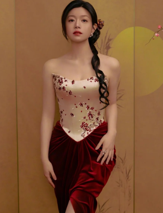 陈妍希扎新中式头发,身穿抹胸上衣搭配红色丝绒开衩裙,真优雅显气质