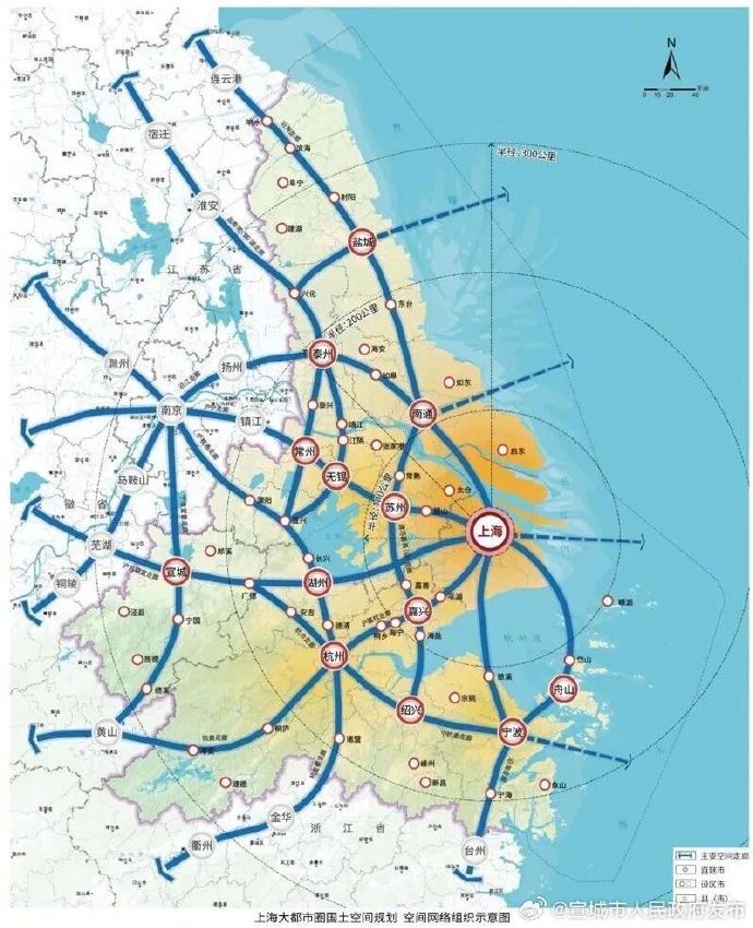 《规划草案》明确,以上海为核心,上海大都市圈范围将包括江苏省苏州市、无锡市、常州市、南通市、盐城市、泰州市,浙江省杭州市、宁波市、湖州市、嘉兴市、绍兴市、舟山市,以及安徽省宣城市共14座城市。