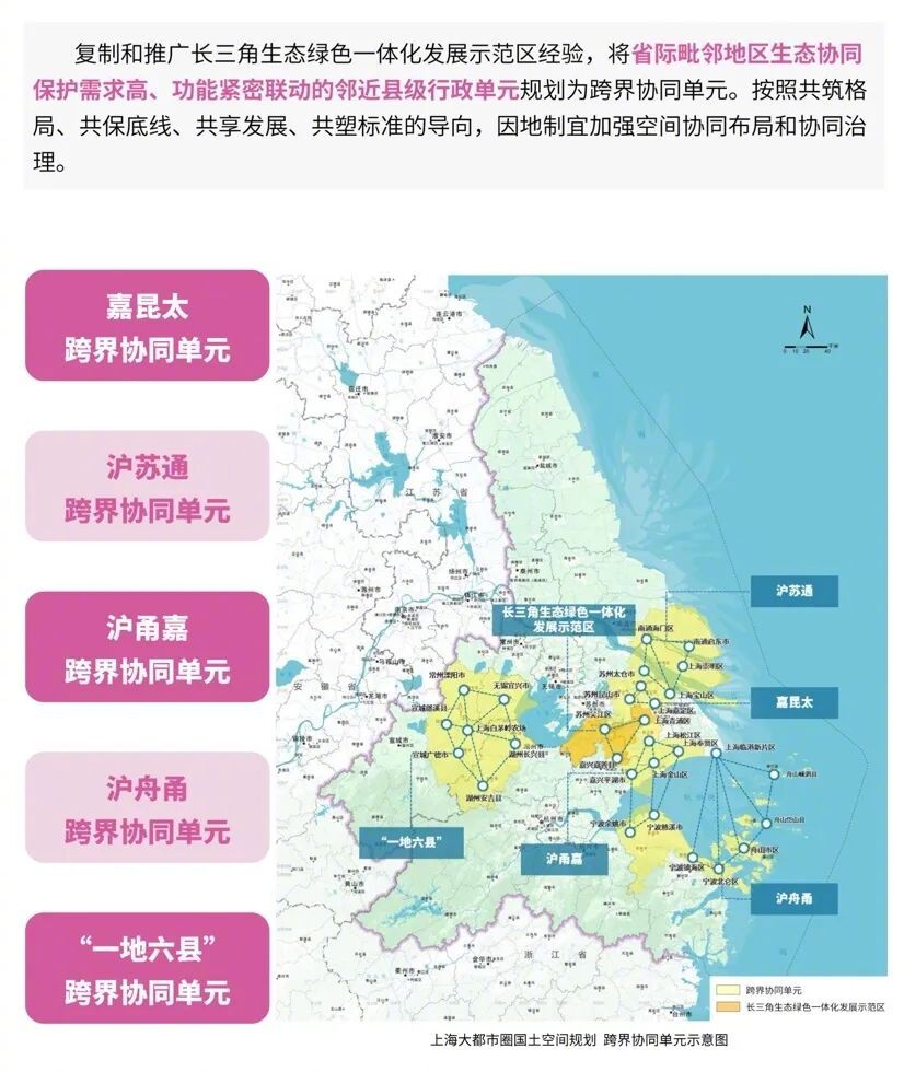 “一地六县”(上海市白茅岭农场,江苏省宜兴市、溧阳市,浙江省长兴县、安吉县,安徽省广德市、郎溪县)跨界协同单元,是《规划草案》五大跨界协同单元之一,也是长三角一体化发展的重要载体平台。