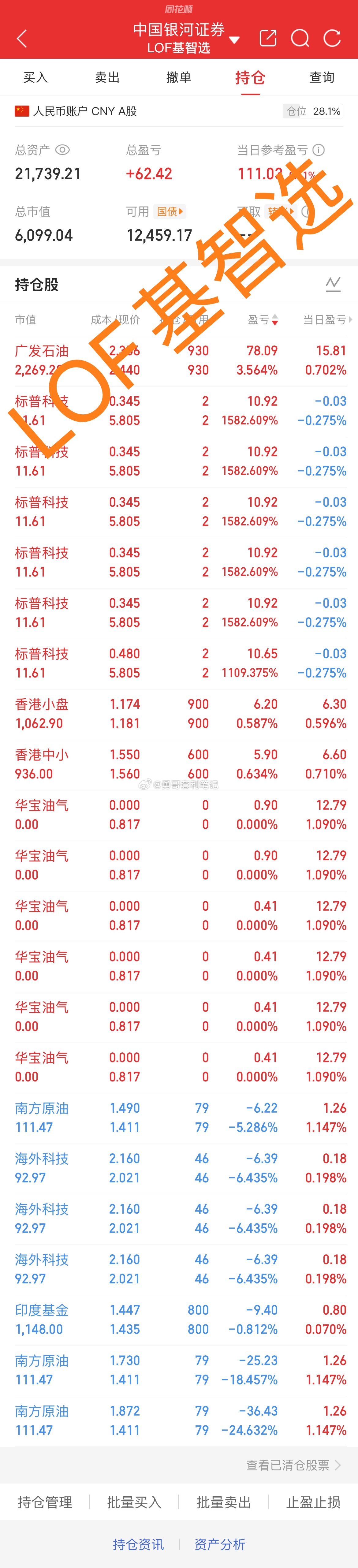 基金套利 标普信息科技溢价率2%,限购10*6,限额低可忽视了。2、华宝油气,华宝油气溢价率2%,限购500*6,原油本身就波动大风险高,加上到账得春节后了,放大了风险,建议观望。仅供参考,抄作业有风险,套利需谨慎,所有申购盘中跳水,溢价率抹平或大幅缩小将撤单!实盘贴图仅作为个人记录之用,不构成任何投资建议及操作指引!盈亏自负,切勿盲目跟风!