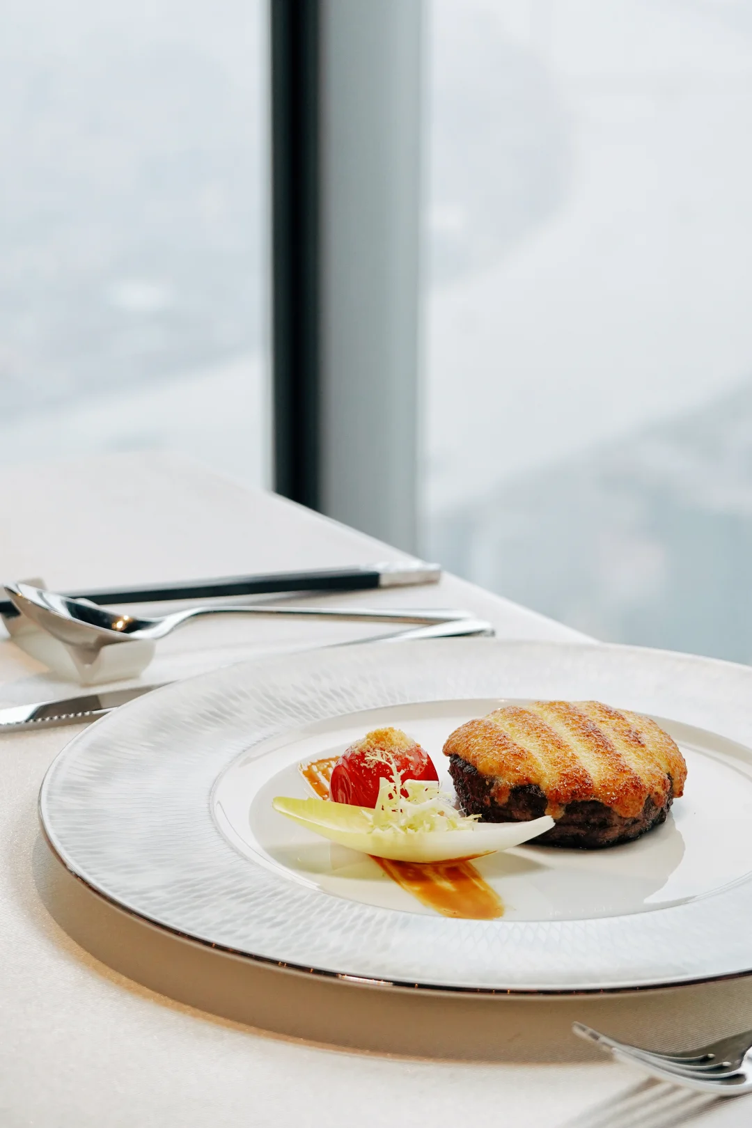 精美的碗碟搭配落地窗外的景色
