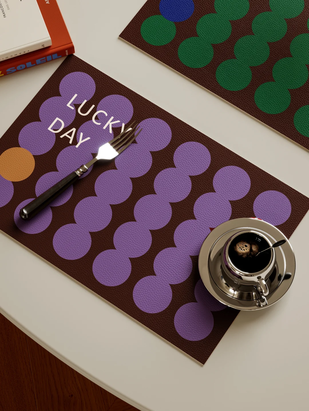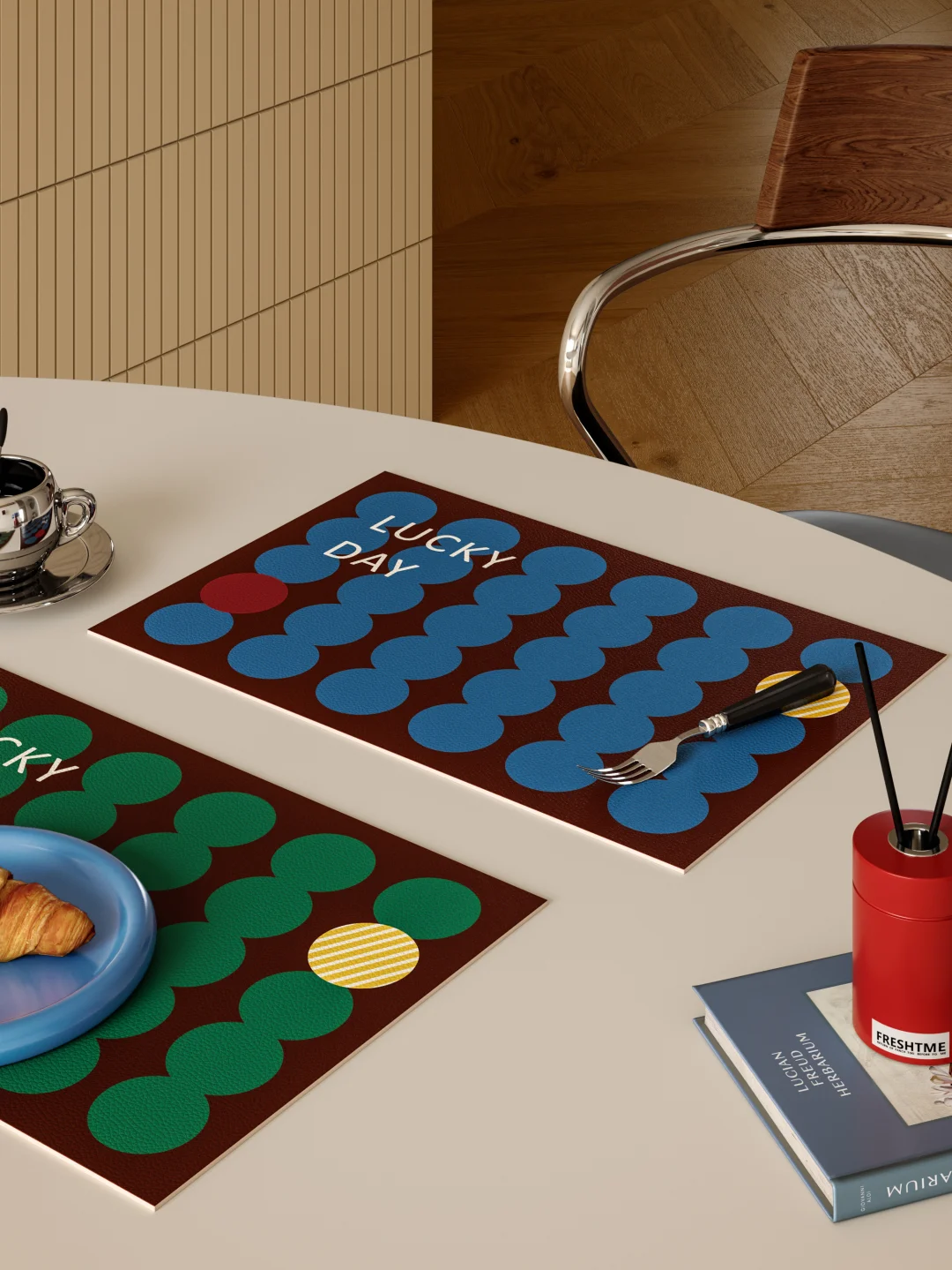 用撞色圆点当餐垫,吃饭都像在逛美术馆! 经典色块拿捏活泼中古调性 —— 复古又不沉闷,氛围感直接拉满✨ - 随便摆个牛角包、咖啡杯都自带画报感📸 皮革材质防水防油,擦一擦就干净美貌和实用度双在线!