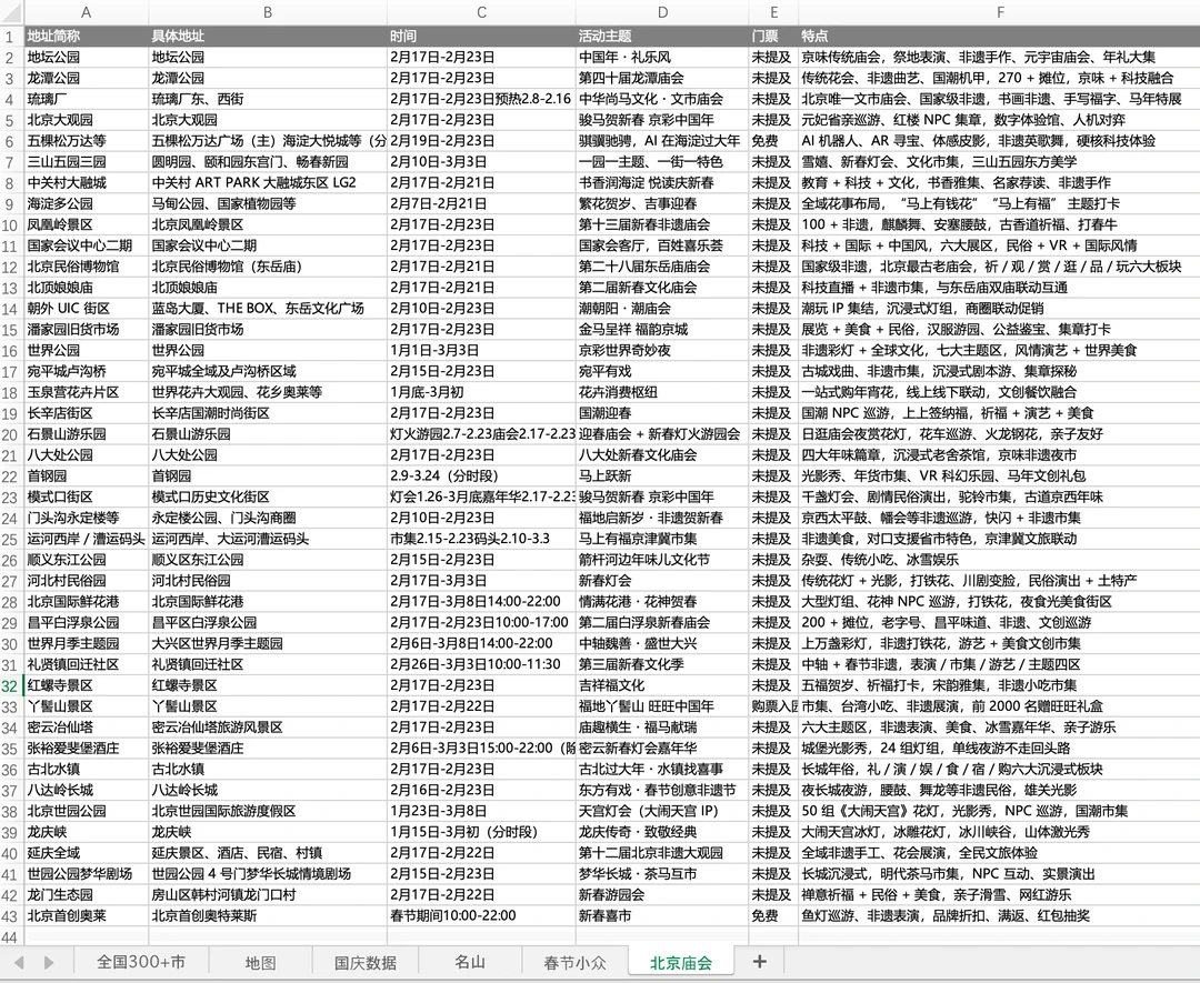 最近我在呈坎、篁岭等地方逛 就感受到了年味了 有鱼灯,龙灯,还挺好看的 最近看到北京文旅,及各大景点,商场,公园等 在通知春节庙会,游园会等活动 大部分是从2.16(除夕)开始 到2.23(初七)结束 也有部分是最近就陆续有了 图1:是我整理的分布图,及对应开放时间情况 图2:是详细的信息表 供还在北京的朋友参考呀 PS.去年我去地坛的时候,人可太多了
