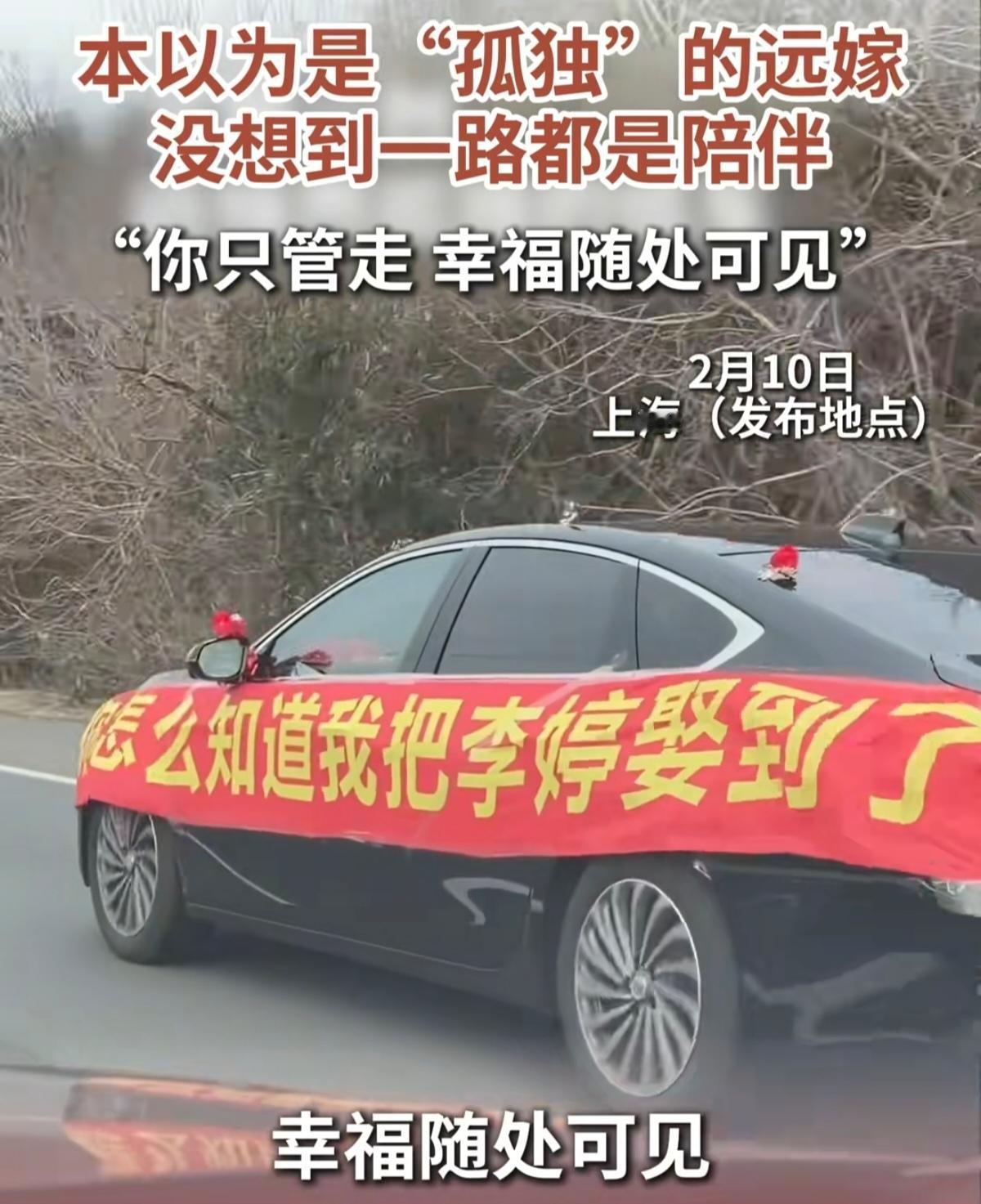2026年2月10日,一条黑色轿车缀着洁白的婚纱,独自驶向远方。车身悬挂的横幅在风中轻颤:“你怎么知道我把李婷娶到了?”这本是李婷远嫁他乡的孤独旅程,却因一群陌生人的善意,化作一场温暖流淌的特别送嫁。 当第一辆陌生车靠近时,车窗摇下的瞬间,司机探出头问道:“就你一辆婚车吗?那我陪你一起!”话音未落,双闪已亮起,鸣笛声里,车载鞭炮噼啪作响。随后,第二辆、第三辆车如星火般加入,无论归家心切的返乡人,还是偶然路过的匆匆过客,纷纷亮起双闪,放慢车速,自发组成护航队列。车灯连成蜿蜒的光河,在高速上流淌,从一辆到六辆,再到六十六辆……越来越多陌生人以沉默的守护,为这场远嫁织就温暖的铠甲。 抵达服务区时,故事迎来最动人的篇章。素昧平生的人们围拢过来,有人递上精心包裹的喜糖,有人掏出随身携带的手写祝福卡片:“愿你们一生顺遂,幸福常伴!”还有人将象征平安的红丝带系在新人车镜上。李婷捧着沉甸甸的喜糖,望着车窗外一张张真诚的笑脸,眼中泛起泪光:“本以为远嫁是孤独的旅程,却收到这么多陌生人的祝福,这条路,再远也不冷了。” 这支由陌生人临时集结的“婚车队”,没有豪华阵容,却以最质朴的方式,将李婷的远嫁之路点染成温暖的画卷。每一辆双闪的车灯,都是人间善意的灯塔;每一声鸣笛祝福,都在诉说:纵使相隔千里,温暖也能在瞬间相连。这绵延数十里的光河,不仅为新人护航,更让无数人看见——原来陌生与陌生之间,可以迸发出如此震撼人心的温情。 愿这份由陌生人编织的温暖,成为李婷夫妇记忆里永不褪色的珍藏。当岁月流转,他们或许会想起:那个冬日的高速上,曾有66道光,为他们照亮前路;曾有无数张陌生的面孔,用最朴素的行动,托起一段婚姻最初的甜蜜与希望。这人间烟火里的脉脉温情,终将化作他们未来岁月里,抵御寒潮的暖意,岁岁年年,皆能触摸到这份特别的祝福。