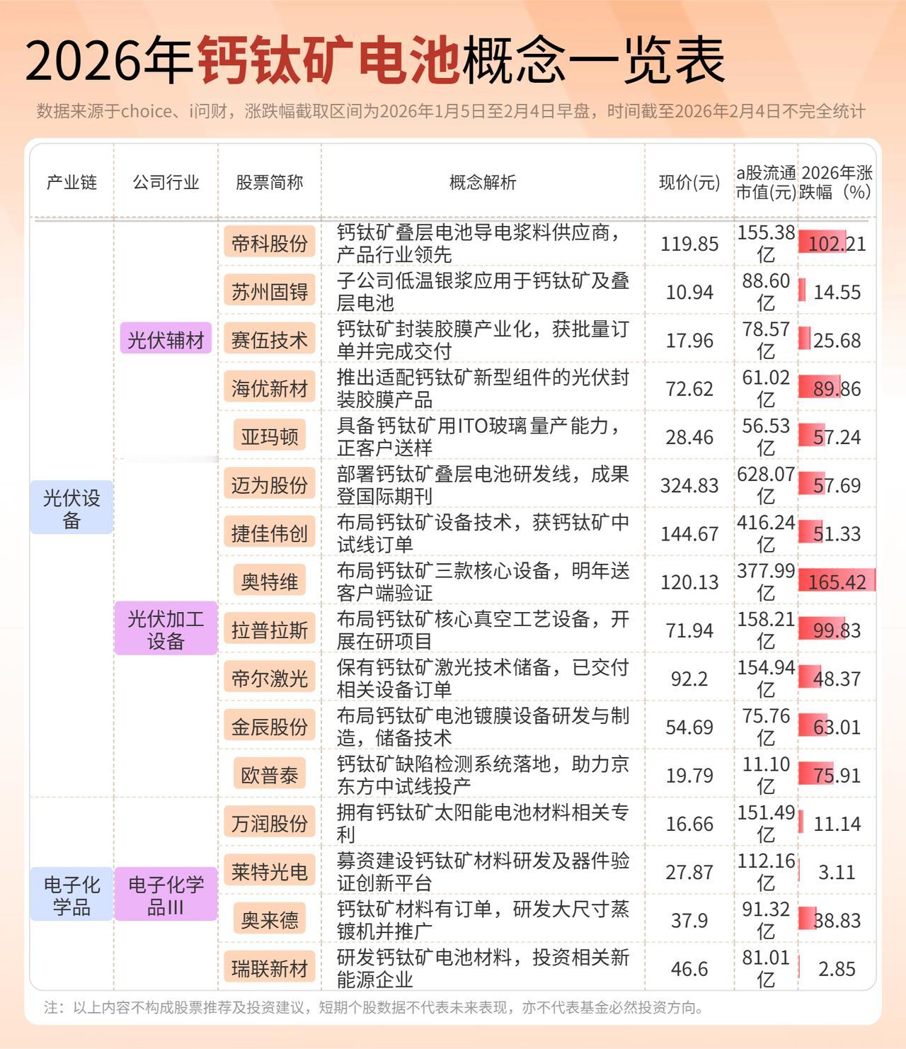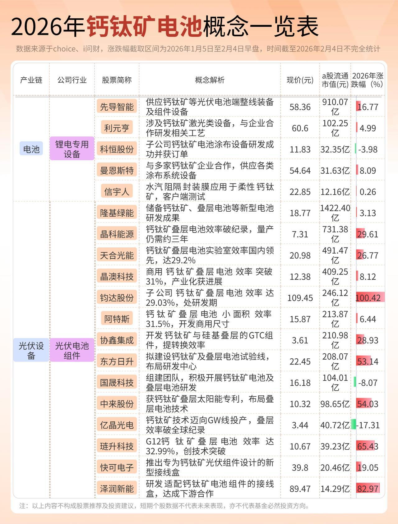 2026年钙钛矿电池概念一览表 (向右滑动图片查看完整名单) 钙钛矿电池概念近期热度上涨,市场关注度提高! 消息面上,市场有传闻称,马斯克团队近期秘密走访了中国多家光伏企业,考察项目涉及设备、硅片、电池组件等环节,其中重点考察了有异质结、钙钛矿技术路线的光伏企业。 钙钛矿电池介绍 1、定义 钙钛矿太阳能电池是一种利用钙钛矿型有机金属卤化物半导体作为吸光材料的第三代太阳能电池。之所以得名“钙钛矿”,是因为它采用了与天然钙钛矿矿物相似的晶体结构(ABX₃型)。 这类电池因具有理论转换效率高、材料成本低、制备工艺相对简单等优势,被视为下一代光伏技术的重要发展方向。除了传统的光伏领域,钙钛矿电池在商业航天、太空算力领域或有一定的应用潜力。 2、市场与产业化情况 目前,行业正处在从“技术验证”向“初期量产”过渡的关键阶段。 市场规模与产能:根据中商产业研究院预测,中国钙钛矿电池市场规模预计将从2025年的约37.5亿元,快速增长至2030年的950亿元。产能方面,2024年新增产能约2GW,预计2025年达4GW,到2030年可能增至161GW。 产业化核心挑战:长期稳定性是制约其大规模商业化的最主要瓶颈,电池在持续光照、湿热环境下的寿命仍需时间验证。此外,如何将小面积实验室电池的高效率、高良率复制到大面积量产组件上,也是一大技术挑战。 热门应用方向:当前最受关注的新兴方向是太空光伏。由于太空光照强度高且稳定,发电效率远高于地面,可为低轨通信卫星、太空数据中心等提供能源。马斯克提出每年部署100GW太空光伏的构想,激发了市场想象。 国外方面:2026年1月22日,特斯拉CEO埃隆·马斯克在瑞士达沃斯世界经济论坛年会期间,在与贝莱德CEO拉里·芬克的对谈中明确力挺太空光伏,并披露关键产能规划。他表示,SpaceX与特斯拉正同步推进太阳能产能提升,目标在未来三年内实现每年100GW的太阳能制造能力,用于地面数据中心与太空AI卫星供能。 私募排排网钙钛矿电池钙钛矿钙钛矿概念钙钛矿概念股领涨两市,哪些玩家值得重点关注?股票交流今日A股概念股梳理股票财经A股市场概念股
