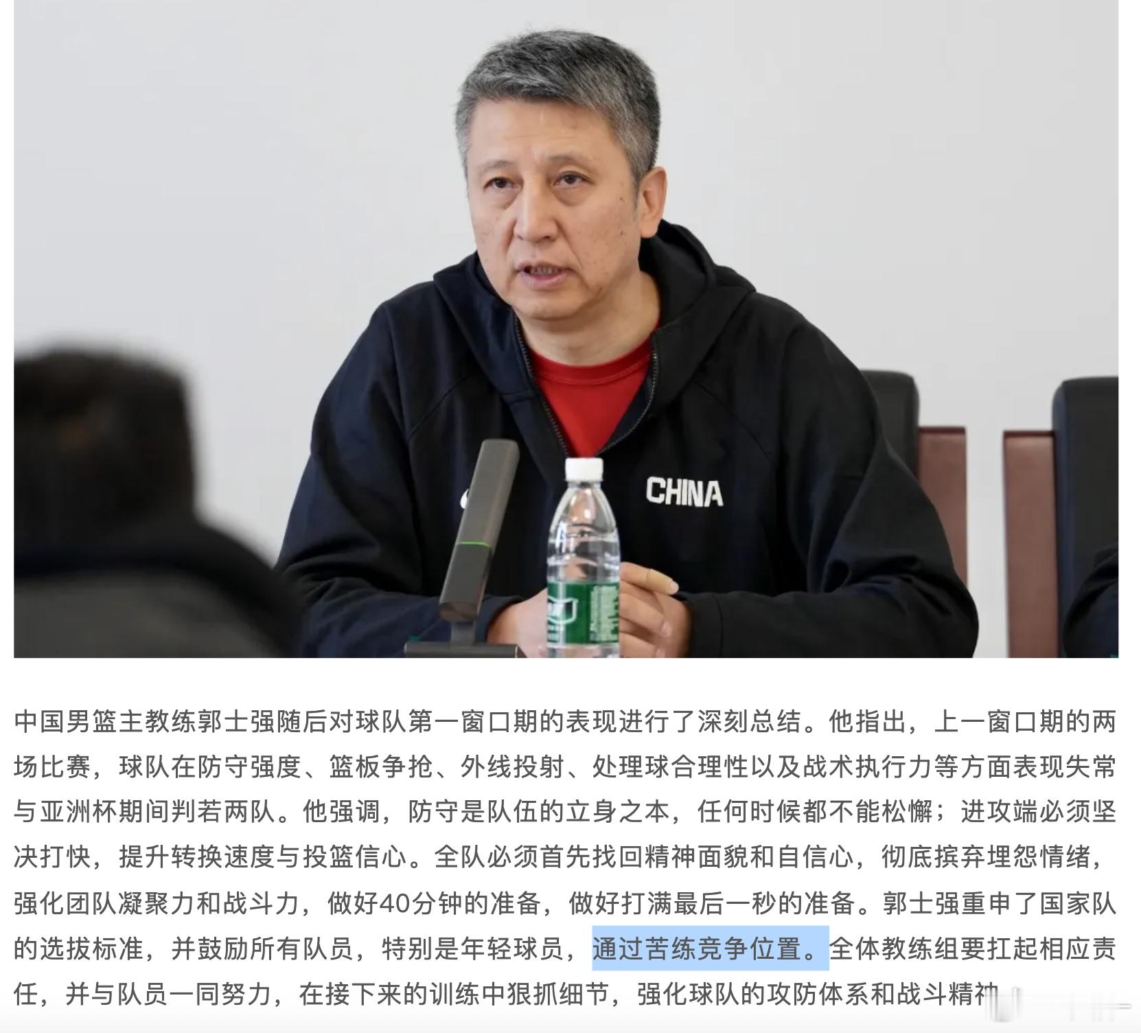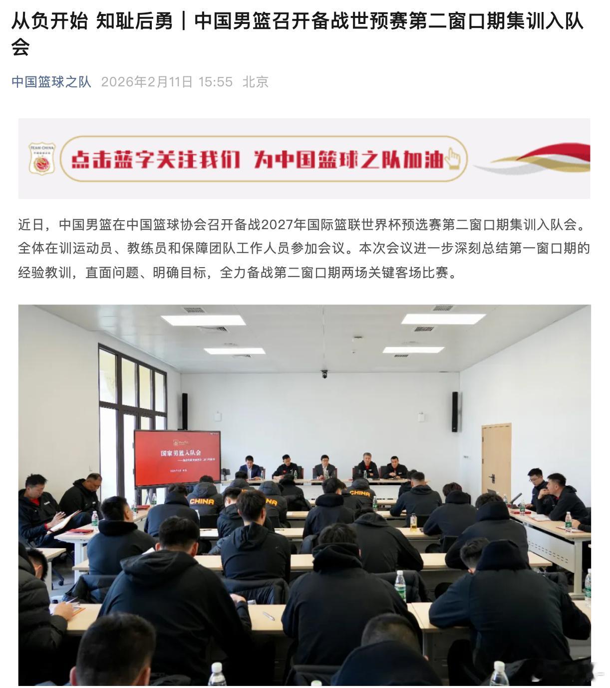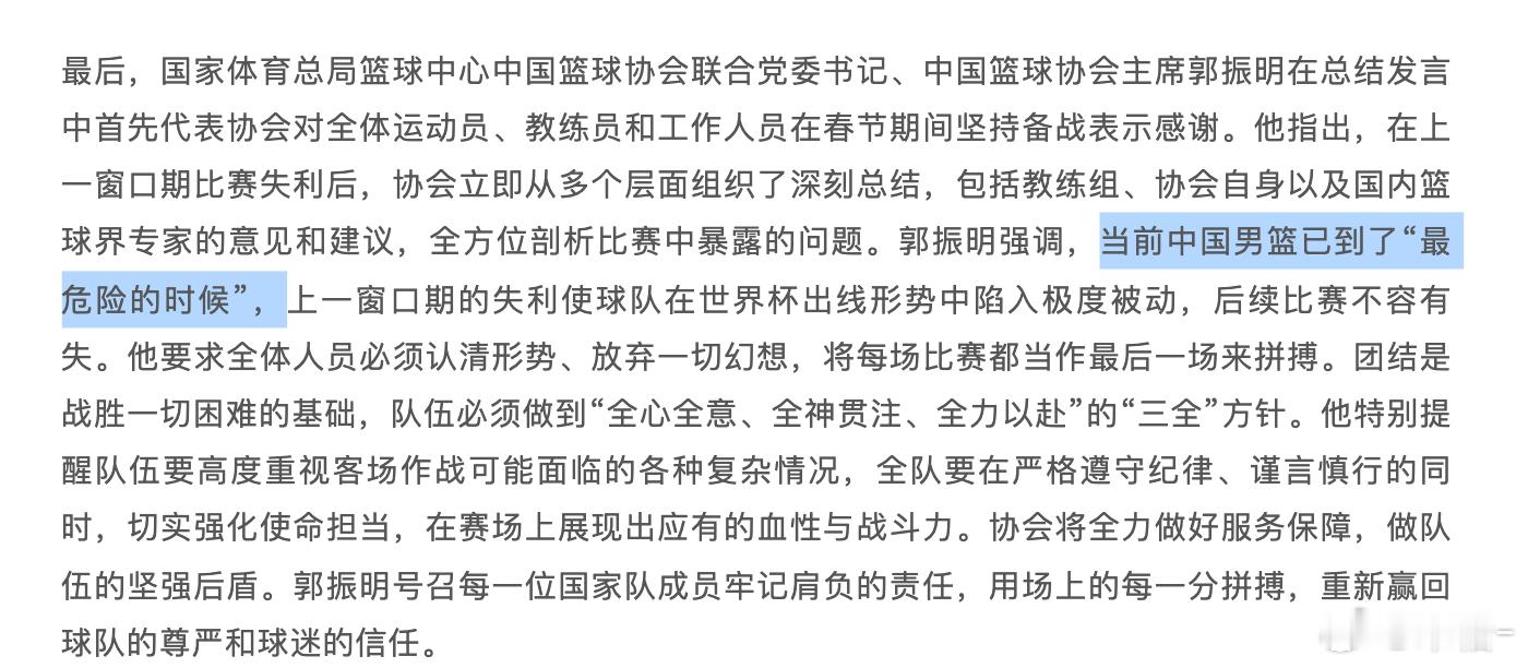 中国男篮 近日,中国男篮世预选赛第二窗口期集训入队会。「从负开始 知耻后勇」深刻总结第一窗口期。9名参加过第一窗口期的队员一致认识到,球队在亚洲杯后出现轻敌情绪;中国篮球协会主席郭振明直言中国男篮已到了“最危险的时候”。