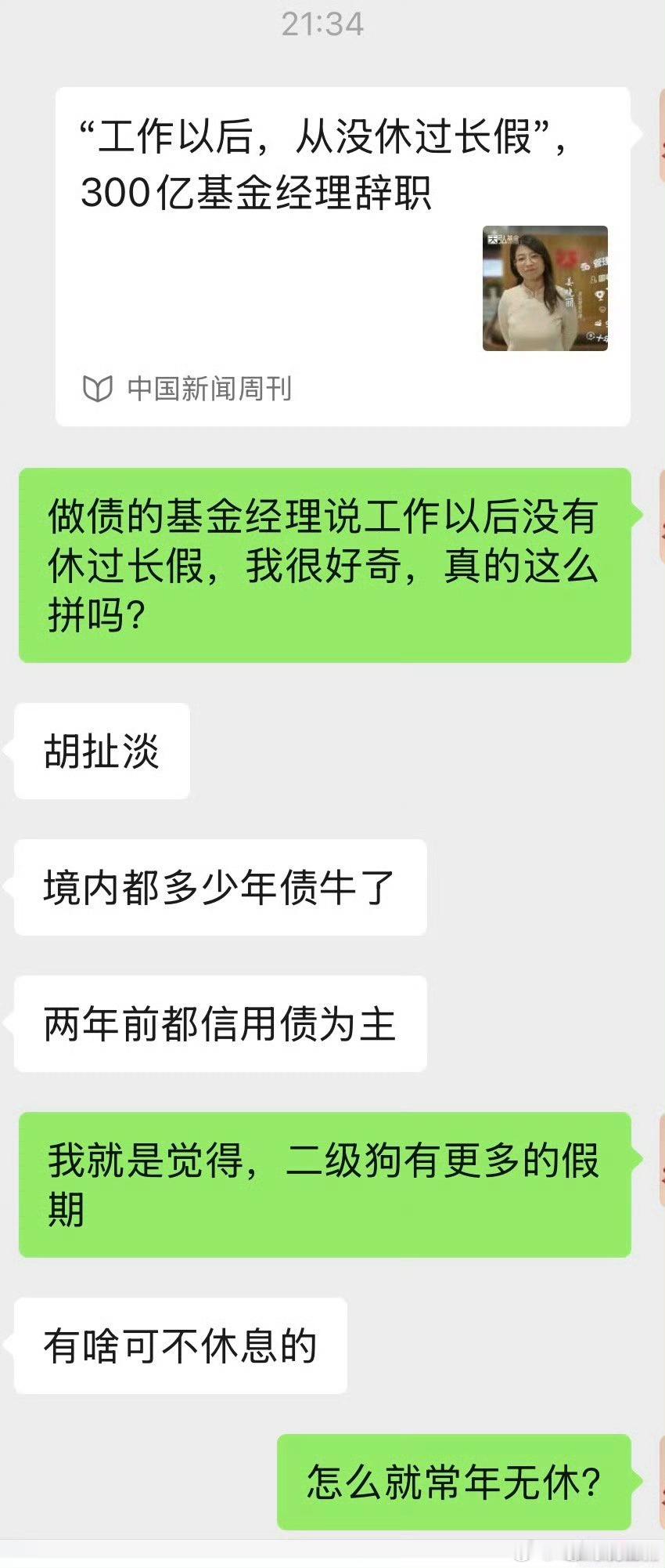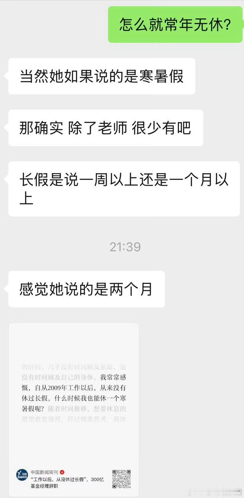 你看,基金经理也觉得自己没有假期。所以,我说,各行各业都应该推广寒暑假。尤其是,地市县医院医护,都是大学生,很多硕博,收入和当地教师比还低,都是事业单位,都是为人民服务,不上夜班,享受假期,是应该的。 更深一层说,全民都应该有寒暑假,拉动内需。