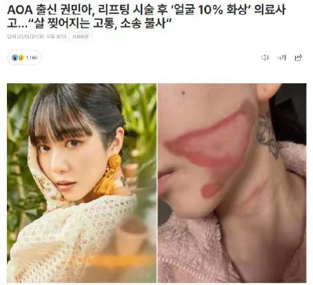 女偶像医美后毁容?!。自曝脸部二度烧伤照!痛哭喊:皮肤像被撕开...工作全完了... 前AOA组合成员权珉娥近日通过社交媒体晒出面部受伤照片,她表示:“因为想要变漂亮,所以进行了睡眠紧致提拉术,但醒来之后脸上的皮肤撕裂般的疼痛,面部皮肤被灼伤。经诊断为2度灼伤,面部10%被灼伤。” 权珉娥还称医院方面否认手术过程中存在过失,要求仅赔付“法律上合理的金额”,目前权珉娥正在准备提起民事、刑事诉讼。 因为此次事故,权珉娥取消了近期所有工作行程,而在金钱上的损失之外,自己还遭受到精神上的痛苦,导致恐慌发作。 她也感叹表示,自己已是另一桩历时超过4年的诉讼案件受害者,如今再次卷入官司,身心都感到相当疲惫,但仍强调“与其委屈吞下,不如让法律给出诚实的判决”,展现不退让的态度。 权珉娥于2012年以女团 AOA 成员身分出道,曾以〈短裙〉、〈心动〉、〈怦然心动〉等夯曲走红,一度跻身人气女团之列。 2019年退团后转往演员发展,2020年她公开指控团内长期霸凌,引发轩然大波,时任队长 申智珉 也因此退出团体,成为 AOA 最终解散的重要导火线。 去年11月,权珉娥宣布与 Modenberry Korea 签约,表态将重新回归演员跑道,没想到近日又在双方同意下解约。 如今再遇上医疗事故,短期内恐难重返萤光幕前,未来将暂时专心治疗与休养。
