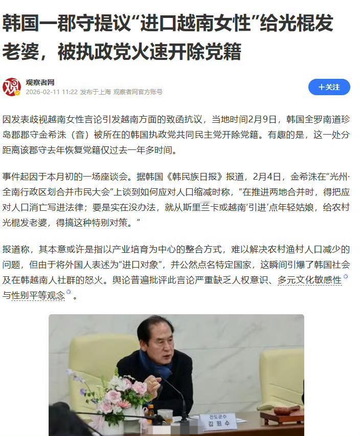 韩官员因称进口女性被开除党籍。 政府出资“进口”斯里兰卡、越南女性,让农村光棍能够成家…虽然“进口”形容不妥,但这对出生率全球第一的韩国,其实是不错的建议。能够顶住“正确”压力提出这样的建议,甚至可以说是“为国为民”。中国其实也可以这样做。[吃瓜群众] 在韩国低出生率危机的大背景下,2月4日,在全罗南道海南郡举行的市政厅会议上,韩国全罗南道珍岛郡郡守金希洙在谈及人口减少对策时表示,应将人口消失问题纳入法制化规范,“必要时可以从斯里兰卡、越南等国‘进口’女性,让农村男性成家”,并称应采取类似的“特别对策”。将女性作为“进口对象”的说法引发舆论哗然。 出席活动的光州市长姜琪正当场表示,使用“进口”一词形容跨国婚姻似乎不妥,以此试图缓和争议,但影响仍迅速扩大。韩国移民、女性及人 权团体也宣布将在珍岛郡厅前举行谴责集会。 在多方压力之下,全罗南道发表道歉声明称,该言论“损害人的尊严,将女性工具化,在任何情况下都无法正当化”,并决定向越南及斯里兰卡驻韩使馆正式发函致歉。金希洙5日发表书面道歉称,其初衷是探讨如何增加外国未婚女性流入、缓解农村婚育困境,但错误使用了“进口”这一表述,并就相关言论造成的伤害再次致歉。但多家韩媒强调,他的解释远远不能平息来自社会各界的批评及不满。 随着争议持续发酵,共同党9日召开非公开会议,以一致赞成票决定对金希洙实施开除处分。首席发言人朴洙贤表示,此举属于针对“在公开活动中发表贬低女性言论、造成重大社会争议”的紧急纪律处分。 该处分距离金希洙2025年重新入 党仅约一年,被韩媒视为执 政党在地方选举临近之际采取的紧急止损措施。韩国舆论此前预测,金希洙将以共同党候选人身份谋求连任,但被开除党籍后只能以无党派身份参选。发现被男朋友骗了怎么办? 海外新鲜事 你有没有被骗自己的眼泪的经历