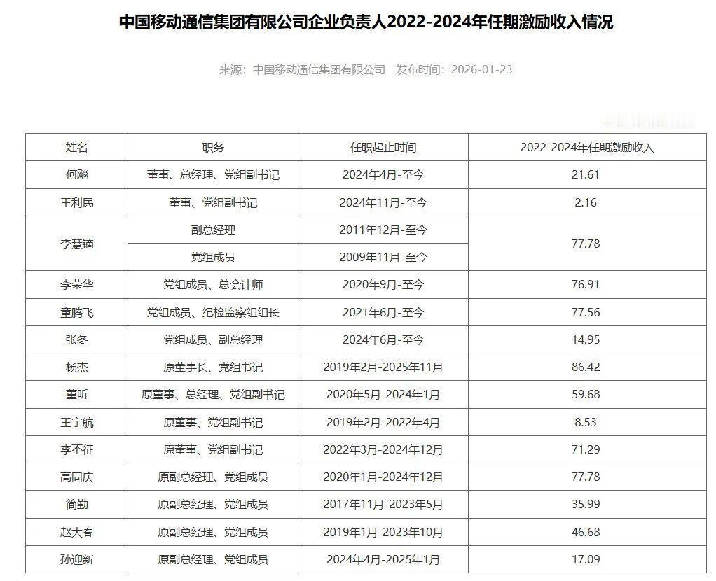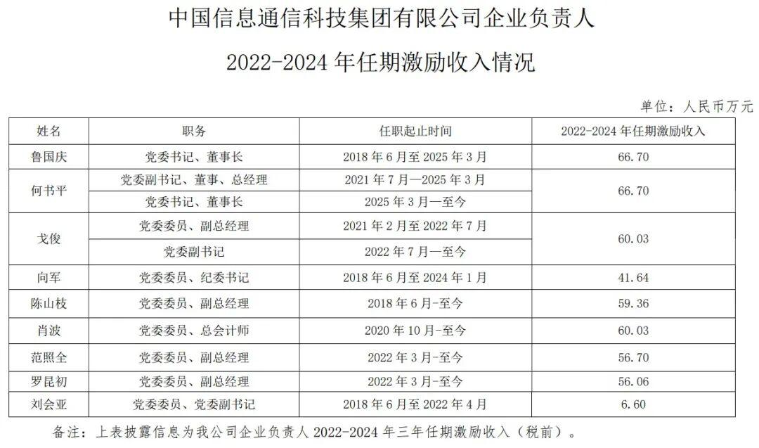 【三大运营商高层激励收入曝光,加起来年薪达百万】 根据国资委近日公开的央企负责人2022-2024年任期激励收入信息,三大电信运营商及中国信科的高层激励情况随之披露。该激励收入每三年发放一次,与年度薪酬共同构成企业负责人薪酬体系。 数据显示,中国电信董事长柯瑞文任期激励收入为83.72万元,总经理刘桂清为75.35万元。中国联通原董事长陈忠岳为80.49万元,总经理简勤为20.12万元。中国移动原董事长杨杰为86.42万元,总经理何飚为21.61万元。中国信科相关负责人鲁国庆、何书平均为66.70万元。