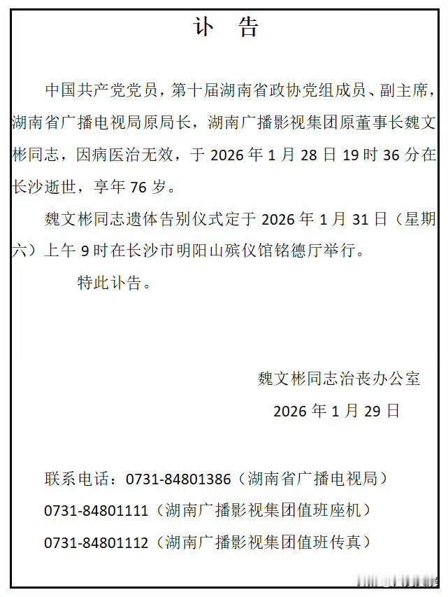【著名媒体人魏文彬离世 】 据报道,湖南广电原局长魏文彬逝世 。作为电视湘军的领军人物,魏文彬和他的团队曾打造出《快乐大本营》《乡村发现》《玫瑰之约》《真情》等知名电视栏目,引领了中国电视节目的大众化潮流。 曾任湖南广播电视台台长、党委书记的欧阳常林撰挽联: 敬挽文彬主席仙逝 相识相知兴广电,湘军神话昆仑魏; 立功立德慰平生,芒果传奇文彬恩!