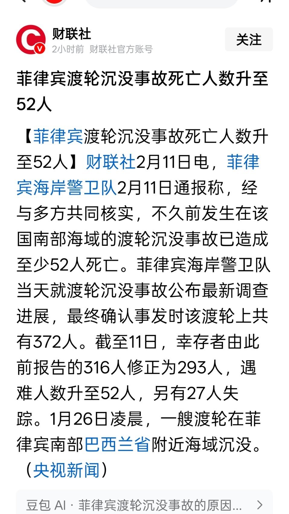 菲律宾渡轮沉没事故死亡人数升至52人