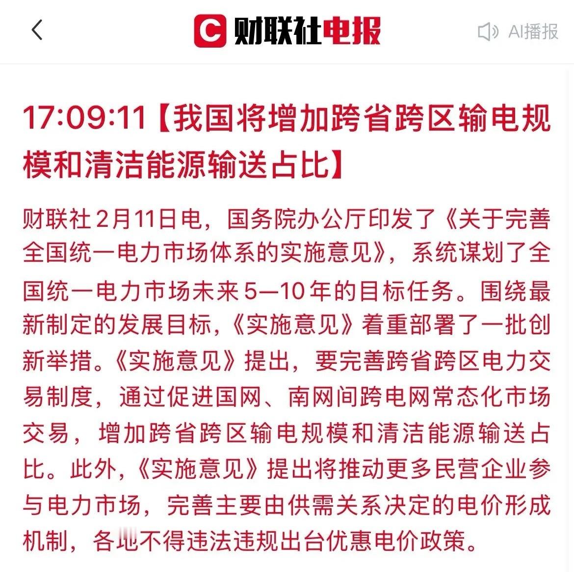 今天,国务院办公厅印发《关于完善全国统一电力市场体系的实施意见》,首次明确提出“增加跨省跨区输电规模和清洁能源输送占比”。信号很明确:全国电力“一张网”不再是愿景,而是真金白银的投资方向。