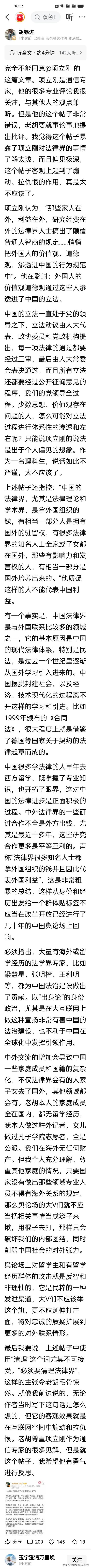 刚刚,胡锡进生气了,怒批项立刚:别用偏见撕裂法律界! 项立刚刚炮轰法律界“被外国渗透”,老胡直接开怼,言辞犀利,要求他像之前董明珠那样反思道歉。 1. 批立法渗透论:中国立法由党领导,经人大三审、公开征求意见,少数人根本无法体系性渗透,项立刚纯属偏见想象。 2. 批拿钱卖国论:法律界与外国合作多是平等互利,很多海归学者是为中国法治建设做贡献,绝非“拿外国钱代表外国利益”。 3. 批全家在国外论:家人在国外不代表不爱国,很多领域专家子女也在国外,这种标签化攻击是在撕裂社会。 4. 批煽动仇恨:项立刚的言论客观上煽动对立、拉仇恨,严重破坏法治建设,不利于中国参与全球化。 5. 批专业浅薄:作为通信专家,项立刚对法律界认知太浅,说话不严谨,缺乏科学精神。 老胡在2026年1月25日回应网络舆论时的表述,强调“不说话也是一种权利”,反对网络上“逼人表态”的风气。今天,老胡要求项立刚反思,项立刚当然也可以选择保持沉默,以免唇枪舌战再被禁言。