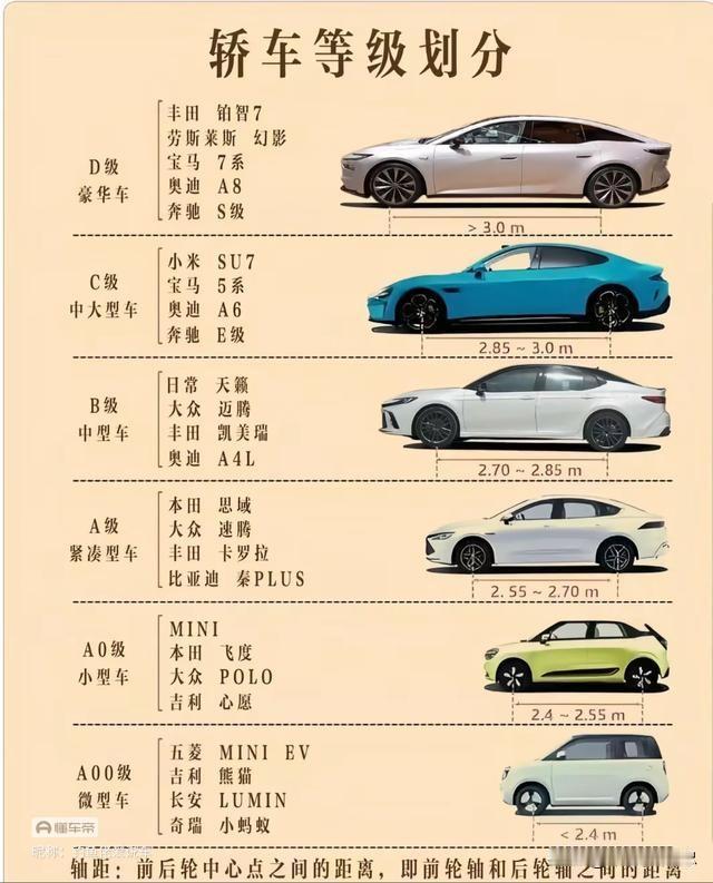 轿车等级如何区分?一张图片带你了解轿车AOO级到D级豪华车差距。 五菱MINIEV和本田飞度同为A0级 本田思域紧凑型 天籁定位B级 小米SU7居然是中大型车 汽车档次 B级车排行 a级轿车的对比 汽车品牌层级 车级别分类