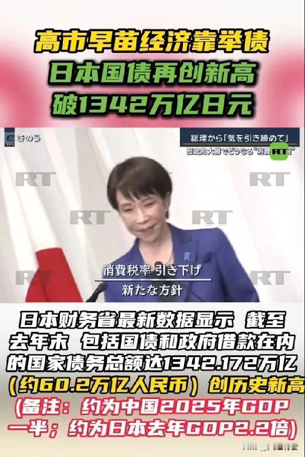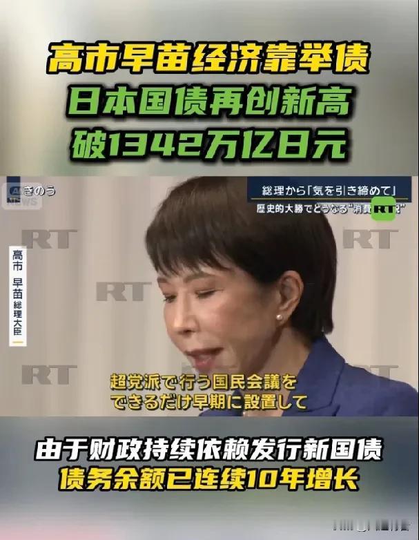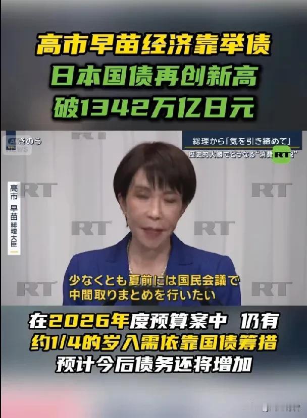 日本国债再创新高,已突破1342.172万亿,对高市早苗政府有何影响? 据《今日俄罗斯》报道,2月11日,日本财务省最新数据显示,截至去年末,国家债务总额已达1342.172万亿(约60.2万亿人民币),创下历史新高。 该债务额较前一年增加约24.53万亿(约1.1万亿人民币)。由于财政运作持续依赖发行新国债,债务余额已连续10年增长。在2026年度预算案中,仍有约四分之一的岁入需依靠国债筹措。日本财务省预计,今后国家债务将继续增加。 目前日本政府债务已占GDP的263%,为全球主要经济体最高。日本2026财年的利息支出(国债费)占预算的比例约为25.6%,相当于每支出4日元就有1日元用于偿还国债债务,这一比例创下历史新高。 日本债务问题给野心勃勃的高市早苗政府带来诸多挑战。高市早苗主张大规模财政扩张和减税刺激经济,这会使政府需发行更多国债,进一步加重债务问题,压缩财政空间,阻碍其他政策实施。 她虽表示要削减补贴、修改整体预算以降低债务与GDP比率,但财政政策缺乏清晰实施路径,实施难度大。同时,高额债务下推进“负责任的积极财政”和加强防卫能力等政策,可能受到债务掣肘无法顺利落地,还会面临来自市场和民众对其财政可持续性的质疑,使经济民生困境依旧难解。 中国台湾著名评论员郭正亮曾表示,日本目前的经济状况比安倍晋三时期更为糟糕,负债率高达GDP的238%,位居世界第一。在产业层面,他认为日本在人工智能、手机、半导体等领域已被韩国甚至台湾地区追赶,且日本前十大公司中有四家汽车公司正面临来自中国的激烈竞争。在货币表现方面,郭正亮提到日元在一年内贬值了40%,甚至在加息背景下依然无法止跌。他直言高市早苗上台后若经济持续恶化、日股暴跌,其政权可能连一年都撑不下去。