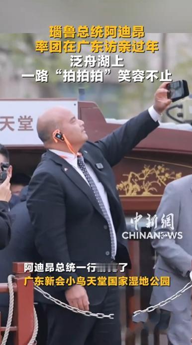 秘鲁总统游广东新会小鸟天堂国家湿地公园,举着手机拍照,站在旁边的保镖抢镜;2月10日阿迪昂和英国首相斯塔默、乌拉圭总统奥尔西一样,访华期间逛逛逛,好嗨哟! 只见他在国家湿地公园拿着手机拍景,认真的样子好有魅力,殊不知站在他后面的保镖也不差,这位保镖穿着职业装,剪着寸头发型,眼神并没有认真看美景,而是眼神犀利,时刻警惕的望着周围,太尽职尽责了吧! 其实,在旅游景点逛的人都是实名制,一般不会有什么危险,但作为秘鲁的随行保镖,职责所在,保护总统先生不出意外才是工作。