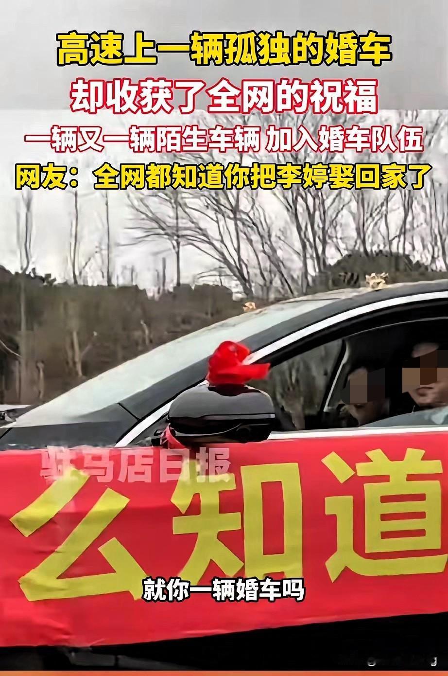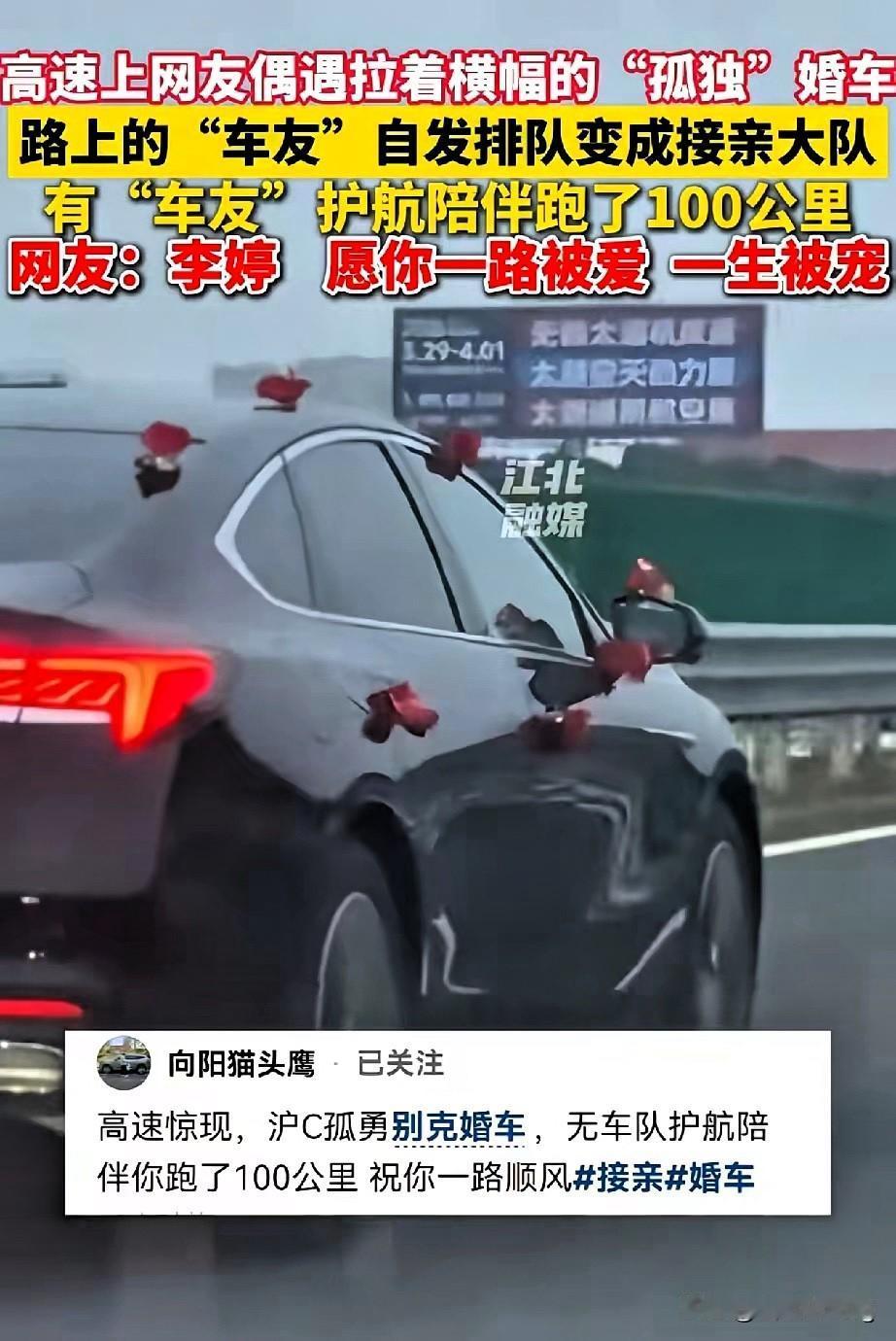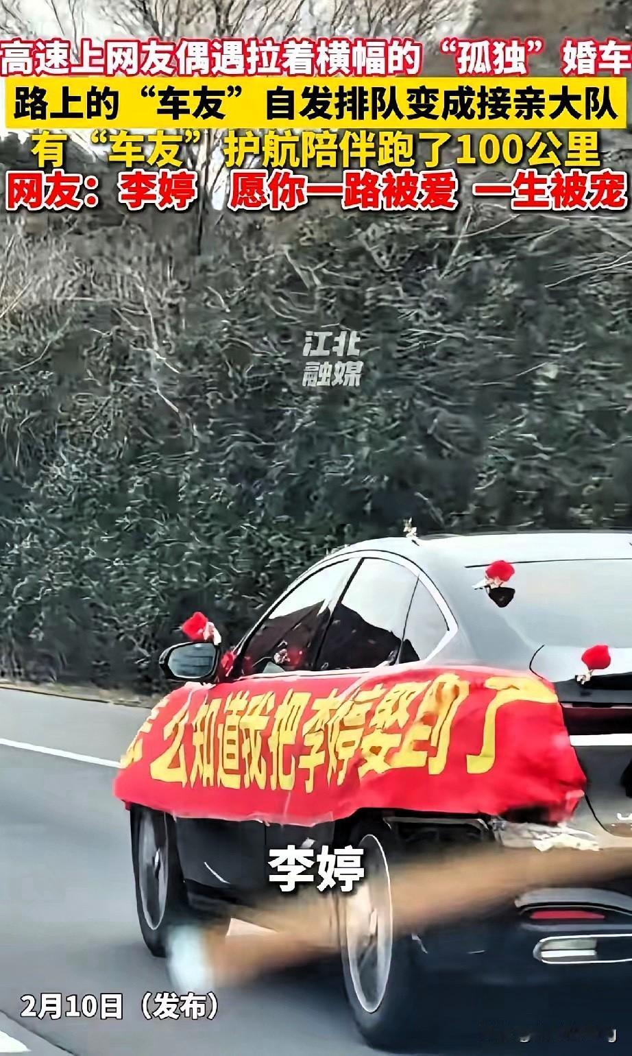 “兄弟就你一辆婚车吗?”这一句问候,暖透了全网! 新郎独自驾车迎娶远嫁的李婷,孤单婚车行驶在高速,一句“我陪你一起”,陌生司机主动护航100公里。越来越多车主自发打开双闪,有序跟行,把孤单行程变成最有排面的送亲队伍。 服务区里新人递上喜糖,满脸都是藏不住的幸福。远嫁从不是孤注一掷的冒险,有爱人身旁守护,有陌生人温柔护航,这份双向奔赴的善意,比任何排场都动人。 这是刻在中国人骨子里的浪漫,平凡人最朴素的善意,总能照亮最温暖的归途。 你被这幕高速护航感动了吗?遇到这样的婚车,你会加入护送队伍吗?
