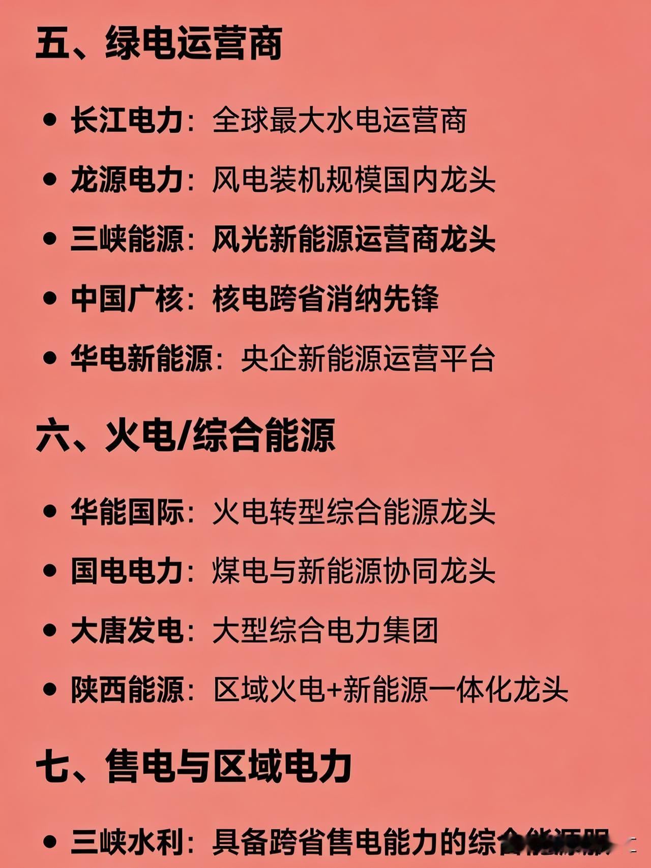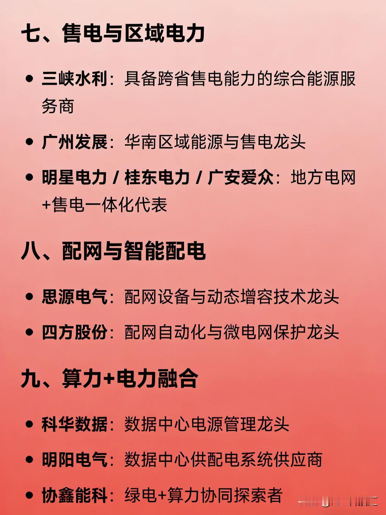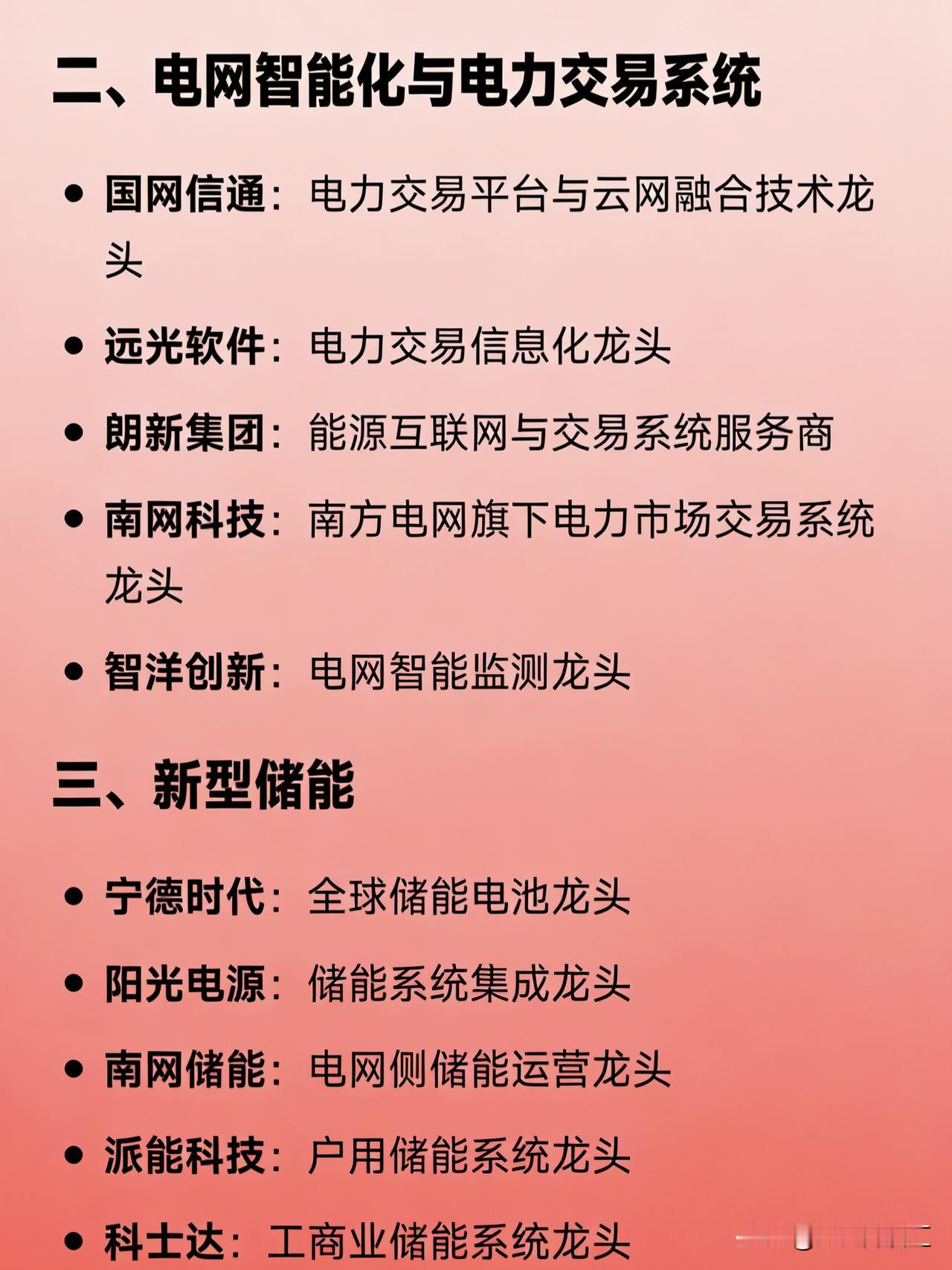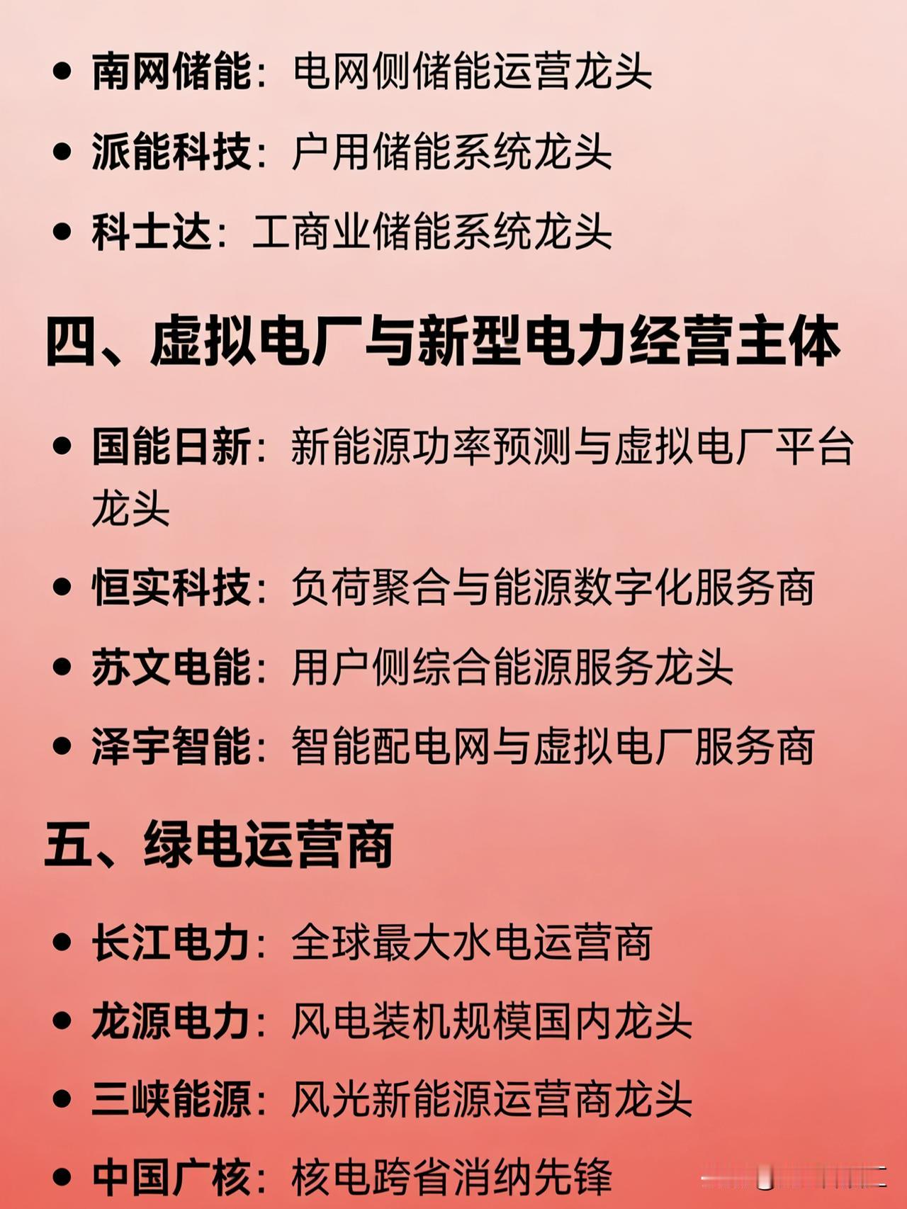 全国统一电力市场概念龙头企业汇总 一、特高压/电网设备 - 国电南瑞:智能调度与特高压稳控系统龙头 - 中国西电:特高压交直流全链设备龙头 - 特变电工:特高压变压器全球龙头 - 许继电气:特高压换流阀与直流控保系统龙头 - 平高电气:特高压GIS开关设备龙头 - 保变电气:特高压换流变压器龙头 - 远东股份:特高压导线单项冠军 - 山大电力:柔性直流输电技术卡位企业 二、电网智能化与电力交易系统 - 国网信通:电力交易平台与云网融合技术龙头 - 远光软件:电力交易信息化龙头 - 朗新集团:能源互联网与交易系统服务商 - 南网科技:南方电网旗下电力市场交易系统龙头 - 智洋创新:电网智能监测龙头 三、新型储能 - 宁德时代:全球储能电池龙头 - 阳光电源:储能系统集成龙头 - 南网储能:电网侧储能运营龙头 - 派能科技:户用储能系统龙头 - 科士达:工商业储能系统龙头 四、虚拟电厂与新型电力经营主体 - 国能日新:新能源功率预测与虚拟电厂平台龙头 - 恒实科技:负荷聚合与能源数字化服务商 - 苏文电能:用户侧综合能源服务龙头 - 泽宇智能:智能配电网与虚拟电厂服务商 五、绿电运营商 - 长江电力:全球最大水电运营商 - 龙源电力:风电装机规模国内龙头 - 三峡能源:风光新能源运营商龙头 - 中国广核:核电跨省消纳先锋 - 华电新能源:央企新能源运营平台 六、火电/综合能源 - 华能国际:火电转型综合能源龙头 - 国电电力:煤电与新能源协同龙头 - 大唐发电:大型综合电力集团 - 陕西能源:区域火电+新能源一体化龙头 七、售电与区域电力 - 三峡水利:具备跨省售电能力的综合能源服务商 - 广州发展:华南区域能源与售电龙头 - 明星电力 / 桂东电力 / 广安爱众:地方电网+售电一体化代表 八、配网与智能配电 - 思源电气:配网设备与动态增容技术龙头 - 四方股份:配网自动化与微电网保护龙头 九、算力+电力融合 - 科华数据:数据中心电源管理龙头 - 明阳电气:数据中心供配电系统供应商 - 协鑫能科:绿电+算力协同探索者
