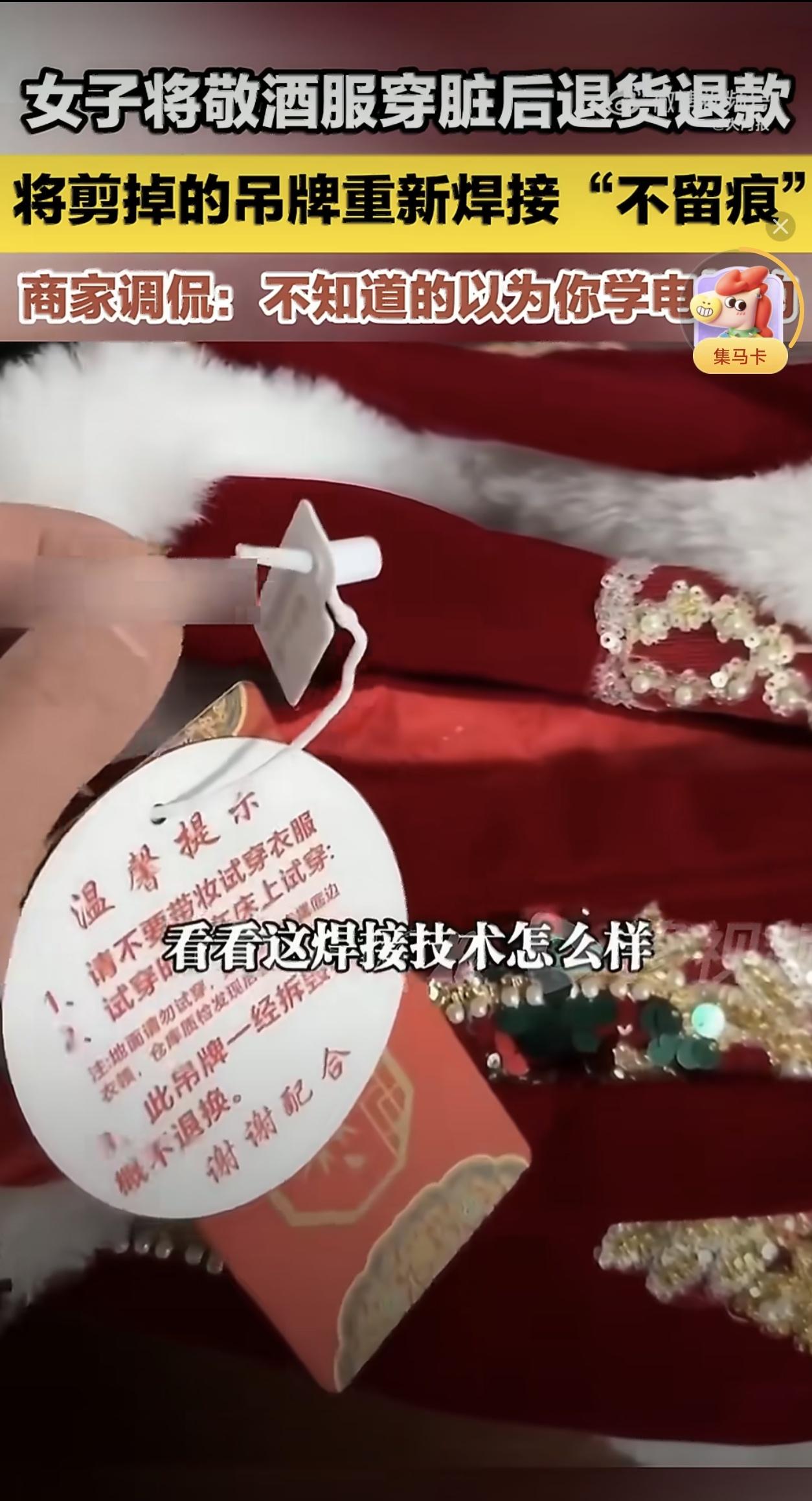 一位女子把穿脏的敬酒服通过焊接吊牌的方式试图退货,结果被商家一眼识破,这位女子网购了一件敬酒服,准备在婚礼上穿。婚礼嘛,大家都懂,敬酒的时候难免会沾上酒渍、油污啥的,这件敬酒服也没能幸免,下摆、领口都留下了明显的痕迹。按理说,穿过的衣服,尤其是这么明显的使用痕迹,肯定是没法退货的。可这位女子不一般,她居然想出了个“妙招”,把吊牌剪下来,然后再用塑料焊接技术给焊回去,伪装成“全新未拆封”的样子,企图利用“七天无理由退货”的政策,把这件脏衣服退给商家。 商家收到退货后,一开始也没多想,毕竟退货也是常有的事。可仔细一检查,就发现了不对劲,吊牌虽然看着完好无损,但接口处有明显的焊接痕迹,就像是给衣服做了个“小手术”,留下了疤痕。再一看衣服,下摆的污渍、领口的磨损,无一不在诉说着它曾经“风光”过。商家这下明白了,这是遇到“高手”了,于是果断拒绝了退货申请,还在网上晒出了对比照片,引发了网友们的热议。 网友们纷纷谴责这位女子的行为。有人说她是“技术满分,人品负分”,把焊接技术用在了这种地方,真是大材小用;有人说她是“耍小聪明”,结果聪明反被聪明误,成了大家的笑柄;还有人说,这种行为严重破坏了消费市场的信任基础,让商家对消费者的退货申请更加谨慎,最终受损的还是广大老实购物的消费者。 确实,这事儿看似只是占了个小便宜,实际上却反映出了更深层次的问题,诚信缺失。在消费市场中,诚信是基石,是买卖双方建立信任的桥梁。如果大家都像这位女子一样,想方设法钻规则的空子,那么这座桥梁迟早会崩塌。到时候,商家不敢轻易相信消费者,消费者也会因为退货难而烦恼不已,整个消费市场都会陷入一种恶性循环。 所以,咱们在购物的时候,还是得讲点诚信,别总想着占小便宜。毕竟,诚信是金,失去了可就再也找不回来了。来源:大河报