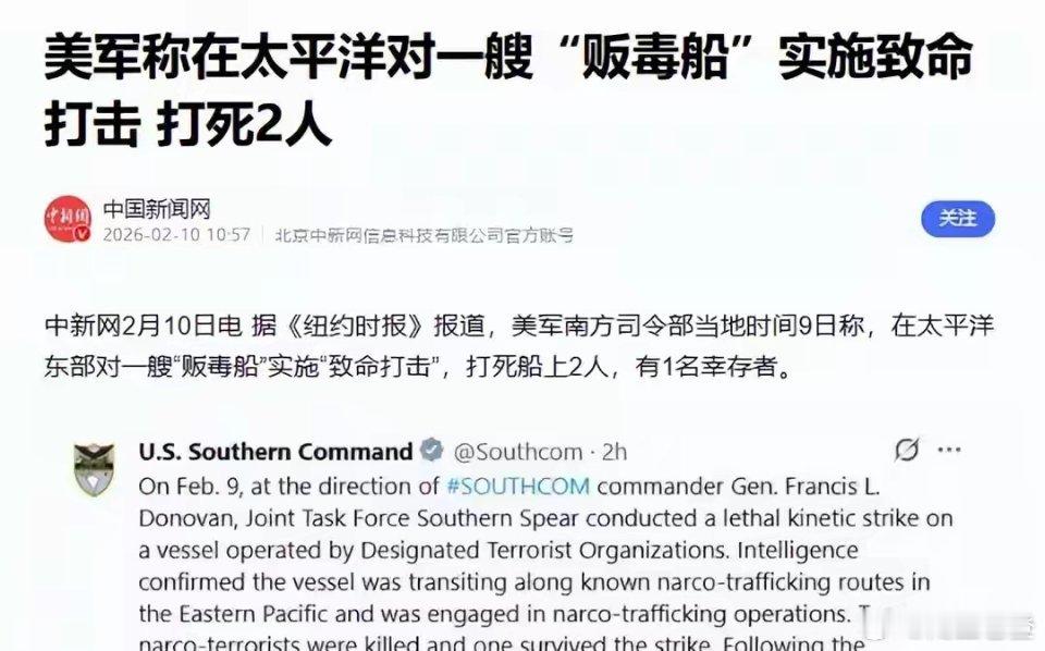 出大事了,特朗普下总统令,美军发起双重袭击,英法俄罕见失声2月9日,美军一天内干了两件大事。太平洋炸沉“贩毒船”致2人死,印度洋千里追扣油轮,与此同时特朗普还在对伊朗放狠话,谈不拢就动武。然而这背后全是美国的霸权算计,看完浑身发冷。B“美军海上双拳出击”2月9日这天美军在全球海域同时上演两场军事秀,每一场都透着霸道,每一个细节都值得细品。太平洋这边当地时间9日,美军南方司令部突然在社交媒体发文宣称,他们的南方之矛联合特遣部队,在太平洋东部打沉了一艘贩毒船。根据美军发布的11秒视频显示,海上突然响起爆炸声,一艘船只瞬间被火光吞噬场面十分惨烈。这次打击直接造成2人死亡,还有1人幸存,美军还嘴硬说行动合法合规,但蹊跷的是自2025年9月初以来,美军就在加勒比海、东太平洋多次打击所谓的贩毒船。中国新闻网的报道去年11月还专门发起了南方之矛军事行动,把这种打击常态化,可直到现在美国政府连一份能证明这些船只涉毒的证据都没公布过。更打脸的是,联合国人权专家早在2025年11月就警告过,美军这种行动根本没有正当司法程序,涉嫌非法杀戮违反国际人权法和海洋法。专家还统计从2025年9月到现在,美军已经击沉18艘船至少69人死亡,而且攻击的都是小型船只,连拦截、逮捕的步骤都没有上来就炸,说白了就是滥杀无辜。为了抓这艘船美军从加勒比海一路追到印度洋,动用了印太司令部的力量,靠着绝对武力压制让油轮根本没机会反抗。更让人不解的是,截至2月11日美国五角大楼始终不肯公布油轮的后续处置方案,既不说是不是临时检查,也不松口会不会没收船只和货物。据船舶追踪网站披露,这艘油轮航行手续齐全,压根没违反联合国决议,美军就是纯粹的霸权行径。看看新闻Knews的报道美军在海上闹得沸沸扬扬的同时,美伊核谈判也进入了关键阶段,特朗普一边放狠话威胁,一边又透露谈判有进展,典型的胡萝卜加大棒套路。B“美伊核谈判重启”事情要从2018年说起,当年美国单方面退出伊核协议,之后就不断加码对伊制裁,把伊朗逼得够呛。如果不能可能会出现不好的情况,说白了就是谈不拢就动武,他还反复强调美军正在往伊朗派庞大舰队,规模比在委内瑞拉的还大就是想靠武力施压。当地时间2月10日特朗普又表态明确说,伊朗不会拥有核武器或者导弹,还透露美伊上周已经在阿曼重启谈判,这是去年6月冲突以来的首次对话,而且伊朗这次态度更柔和。面对特朗普的威胁伊朗也没示弱,伊朗官员明确警告任何美国针对伊朗的攻击,都会招致迅速且全面的反击,既愿意谈判也不惧战争态度十分坚决。不管是美军打击贩毒船、拦截油轮还是特朗普威胁伊朗,看似是孤立事件实则都是美国的霸权算计,目的只有一个维护自己的全球霸权,掌控能源和航道主导权。B“美国的算计”美军海上行动的背后逻辑,特朗普在2025年12月下过一道命令,对所有进出委内瑞拉的受制裁油轮实施全面彻底的封锁。这次拦截阿奎拉II号就是在执行这道命令,但深层目的是想通过控制全球关键航道,打破俄、古巴、委内瑞拉、伊朗构建的,不受美国控制的能源贸易网络。财联社的报道尤其是拦截油轮一方面是想扰乱俄和委内瑞拉的石油贸易,另一方面也是在试探底线,逼迫全球航运企业不敢和被美国制裁的国家合作。而美伊核谈判特朗普的目的也很明确,就是想通过军事威胁+外交拉扯,彻底管控伊朗的核能力和导弹技术,巩固美国在中东的主导地位同时拉拢以色列等盟友。毕竟伊朗一旦拥有核武器或先进导弹,就会威胁到美国在中东的利益,这是特朗普绝对不能接受的。面对美国的霸权行径,很多国家都站出来谴责,委内瑞拉副总统兼石油部长罗德里格说,美军扣押油轮触犯国际法,是殖民主义的延续,委政府会向联合国安理会维权。古巴共产党也发表声明,强烈谴责美国侵略升级,伊朗则表示愿意和委内瑞拉合作,一起应对美国的海盗行为和国际恐怖主义。现在最关键的问题是,美军的这些霸权行动已经开始影响全球,而美伊谈判的不确定性,也让中东局势变得更加复杂。B“霸权的代价”美军在公海随意拦截、炸沉民用商船,彻底打破了公海自由的国际原则,把公海变成了美国的私海。现在全球航运业都陷入恐慌,各国的合法商船都没了安全保障,一旦情况持续很可能导致全球能源运输中断、贸易成本飙升,最终受伤的还是普通国家和民众。虽然现在美伊双方重启了对话,伊朗态度也有所缓和,但分歧依然很大,特朗普的强硬底线、以色列的态度,还有双方过往的恩怨,都可能让谈判再次破裂。到时候特朗普很可能真的会对伊朗动武,一旦开战整个中东地区都可能陷入战乱,影响全球能源供应。不过值得欣慰的是,反霸权的声音正在崛起,联合国已经开始质疑美军的行动,俄、古巴、委内瑞拉、伊朗也可能进一步加强合作,构建独立的航运和能源结算体系,反抗美国的围堵。说到底美国的霸权野心终究是不可能得逞的,从太平洋的爆炸声到印度洋的拦截行动,再到美伊谈判的拉扯,美国看似强势实则正在失去国际道义。