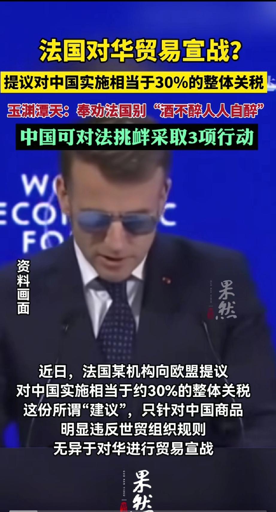 马克龙刚离开没几天就反手打脸了。 近日,法国某机构向欧盟提议对中国实施相当于约30%的整体关税,这份所谓“建议”只针对中国商品,明显违反世贸组织规则,无异于对华进行贸易宣战。 又一头喂不熟的白眼狼,来时一套回去又一套,表里不一,看来不能让法国过得太好,否则他们认不清自己的身份了。来中国的时候咱们就像对待亲戚一样,陪逛,陪吃,陪玩,吃了喝了拿了,回去就在背后阴你。 你对他说几句好话他就飘上天了。就如玉渊潭天说的:奉劝法国别“酒不醉人人自醉”,不要搬起石头砸了自己的脚。 有时候一些旁亲都不靠谱,何况外族,所以,非我族类其心必异,作为中国人一定要谨记在心。 中国也该是时候狠下心来立规矩了,对“不知死活”高卢雄鸡,必须枪打出头鸟。