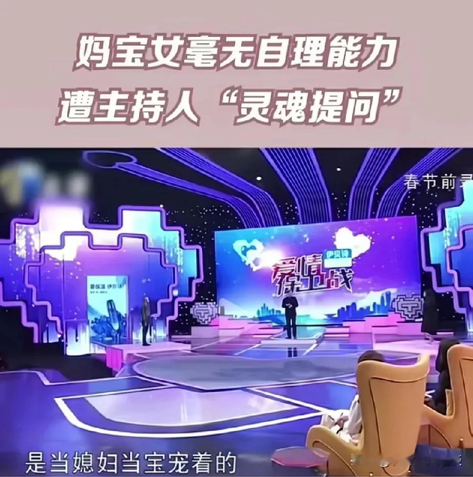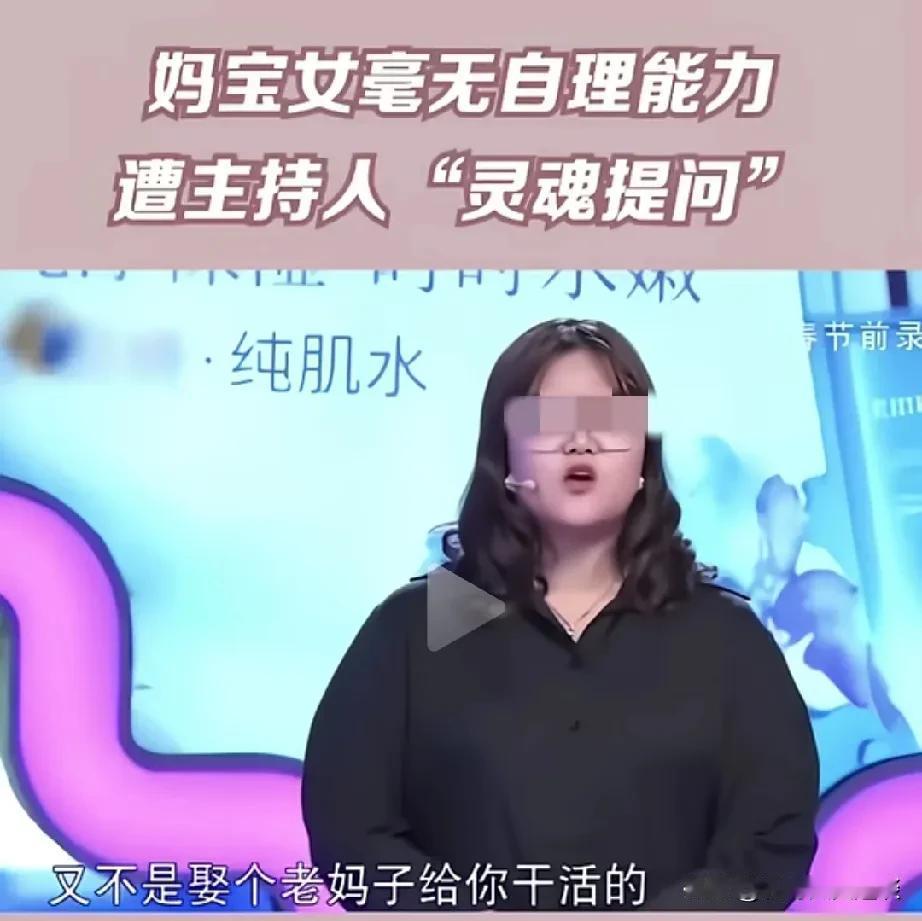 这样的妈宝女,娶回家也是当祖宗养着。在相亲现场,女孩面对主持人和男孩说,结了婚以后,她不会做家务,家里得需要始终保持有保姆。不需要她干活,她也不会干活,从小到大都是她爸妈帮她做。 主持人问她,你生活能不能自理?她说家里🈶她老公呢,还有父母或保姆呢。 男子说,他要上班和出差怎么可能带着她,如果父母不在了呢?女孩说最后不是还有保姆了吗?她嫁到男人家里是让男人宠着的,并不是娶回来一个老妈子帮你干活的。 这样的女孩娶回家能做什么,什么也做不了,还得天天伺候着她。