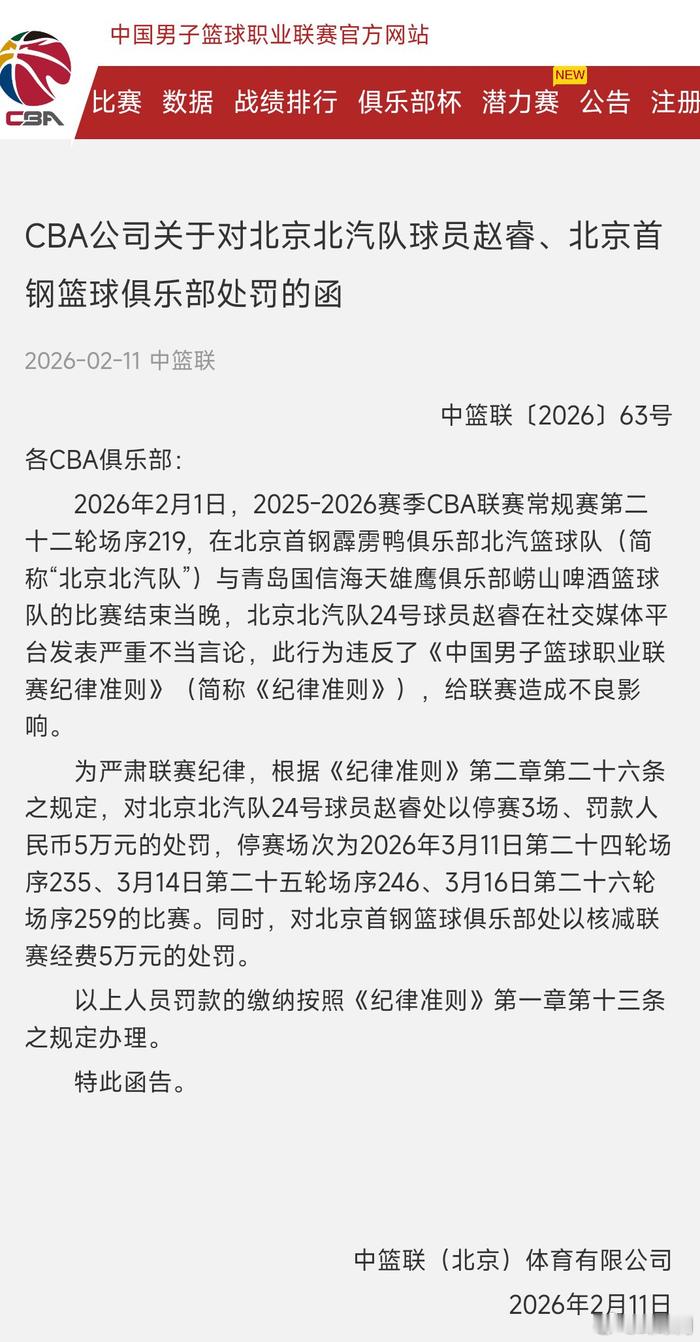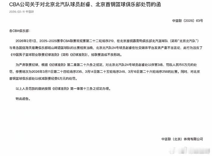 这一处罚延续了CBA“球员违规、俱乐部连坐”的逻辑。 但对国企背景的北京首钢而言,5万元经济影响微乎其微,象征意义更大——俱乐部需为球员言行承担管理责任。 而对赵睿来说,停赛3场意味着球队战术核心真空。 本赛季他场均10.9分5.7助攻,是首钢进攻的“发动机”,缺阵可能让球队季后赛卡位战雪上加霜。