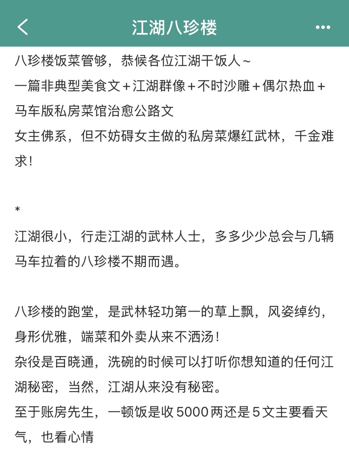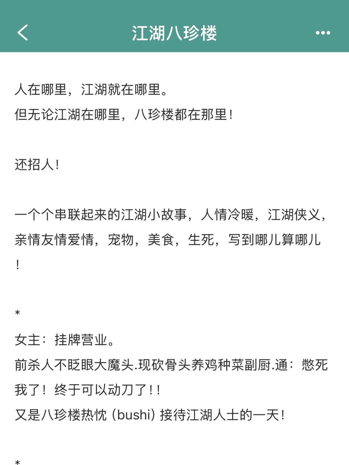 搞笑治愈经营美食文!搞笑治愈经营美食文! ※本文又名《王姑娘的移动江湖私房菜馆》,移动马车版私房菜馆。 ※正经私房菜馆,八珍楼堂食居多,偶尔提供外卖服务。 ※美食+群像+温馨+救赎。 书名:《江湖八珍楼》 作者:求之不得 标签:古言小说、甜文、美食文、群像文、完结文