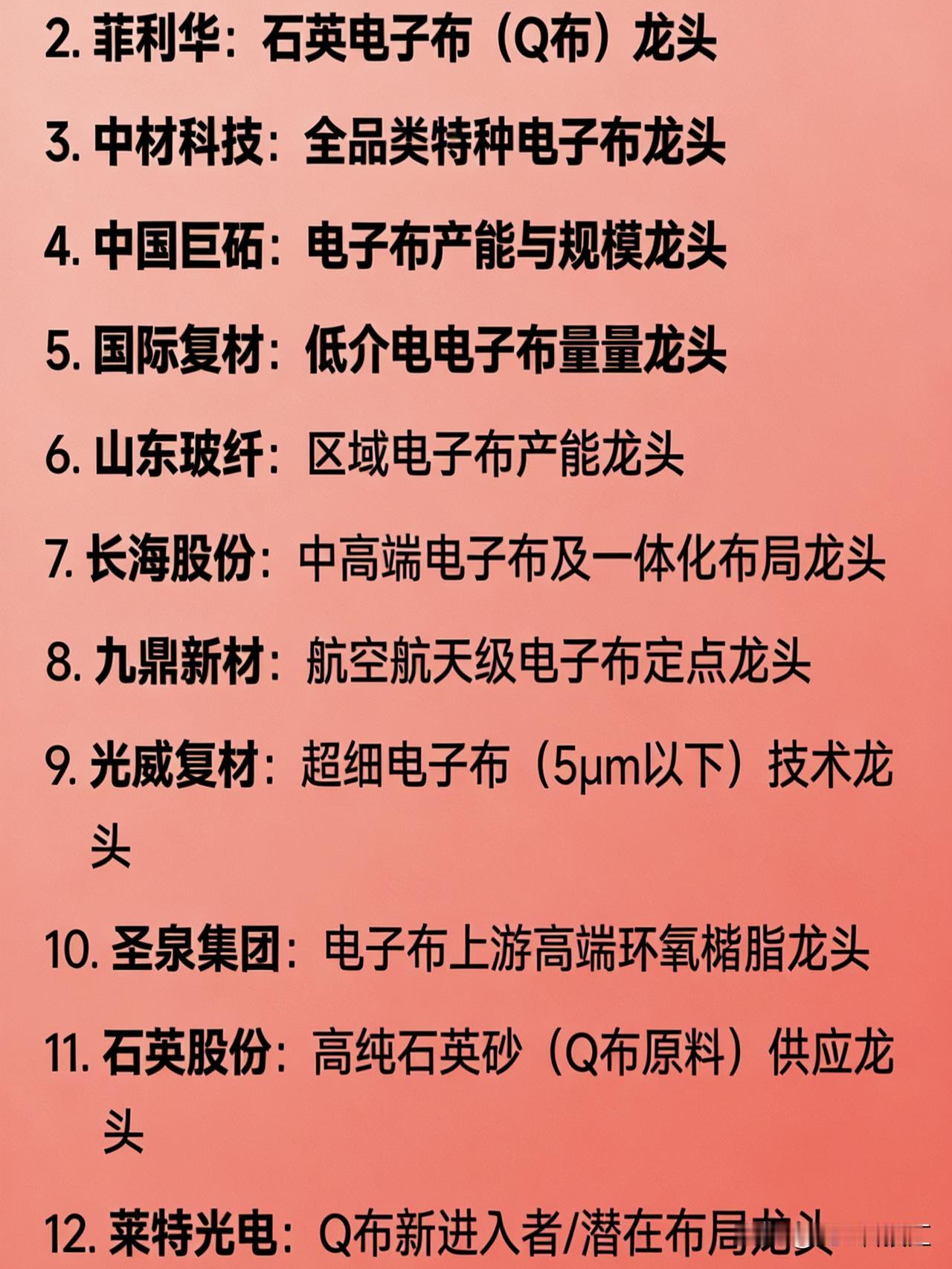 电子布概念相关企业的龙头定位汇总 宏和科技:超薄/极薄电子布龙头 菲利华:石英电子布(Q布)龙头 中材科技:全品类特种电子布龙头 中国巨石:电子布产能与规模龙头 国际复材:低介电电子布量产龙头 山东玻纤:区域电子布产能龙头 长海股份:中高端电子布及一体化布局龙头 九鼎新材:航空航天级电子布定点龙头 光威复材:超细电子布(5μm以下)技术龙头 圣泉集团:电子布上游高端环氧树脂龙头 石英股份:高纯石英砂(Q布原料)供应龙头 莱特光电:Q布新进入者/潜在布局龙头