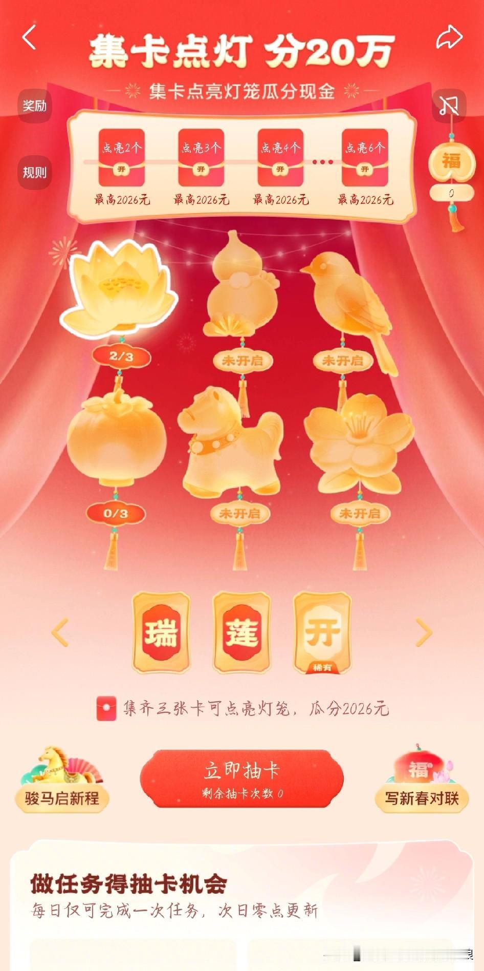 🧧 集卡领红包 集卡啦!简单点,玩得爽。 集齐就能领现金红包,不套路、不绕弯,点一点就能抽。 多集多得,越集越旺,年味和红包一起到位。 动动手指,好运到手,快来一起集卡开红包!