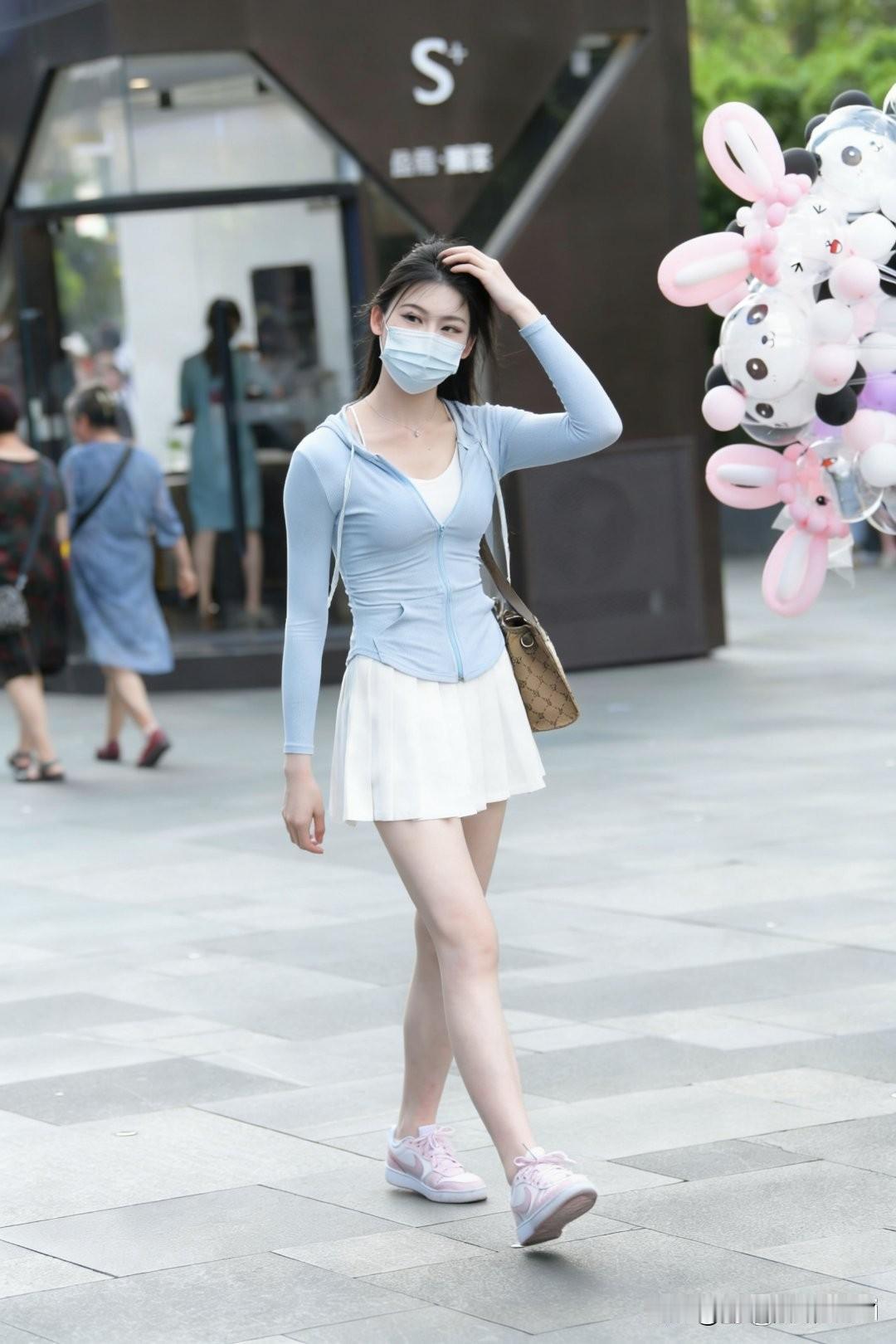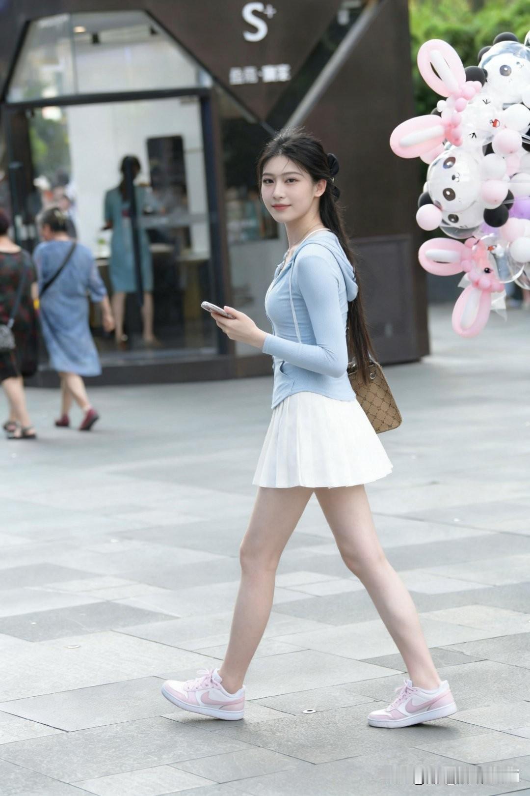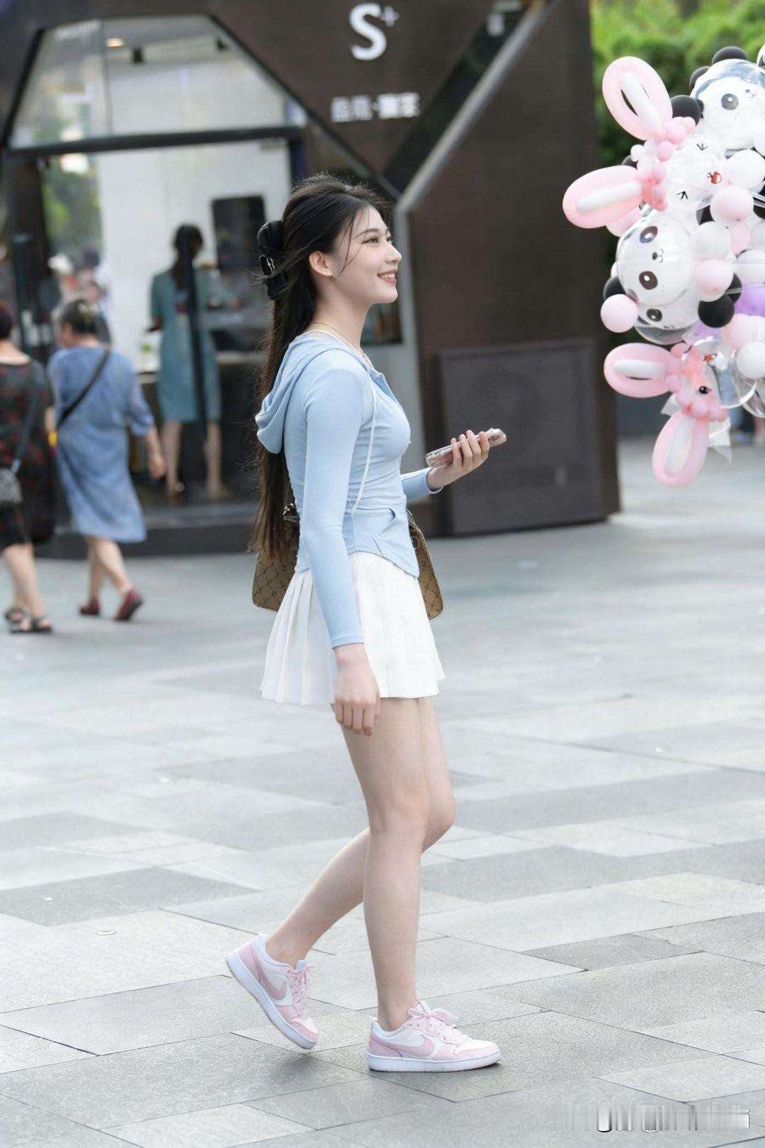 元气少女漫步街头的画面,简直太美好啦!浅蓝色套装裙配粉红色运动鞋,这搭配青春靓丽又活泼可爱。就像夏日街头那些时尚达人,蓝色吊带衫清凉又清新,蓝色包臀裙时尚又精致,再配上粉色运动鞋,可爱又文静。 还有深蓝色 T 恤配白色小短裙,搭粉色运动鞋,纯真少女感直接拉满;白色背心裙配深蓝色方格围裙,再搭粉白色球鞋,养眼极了。元气少女这一身粉鞋蓝衣,走在街上就是一道亮丽的风景线,轻松自在的模样让人看了都心情愉悦。