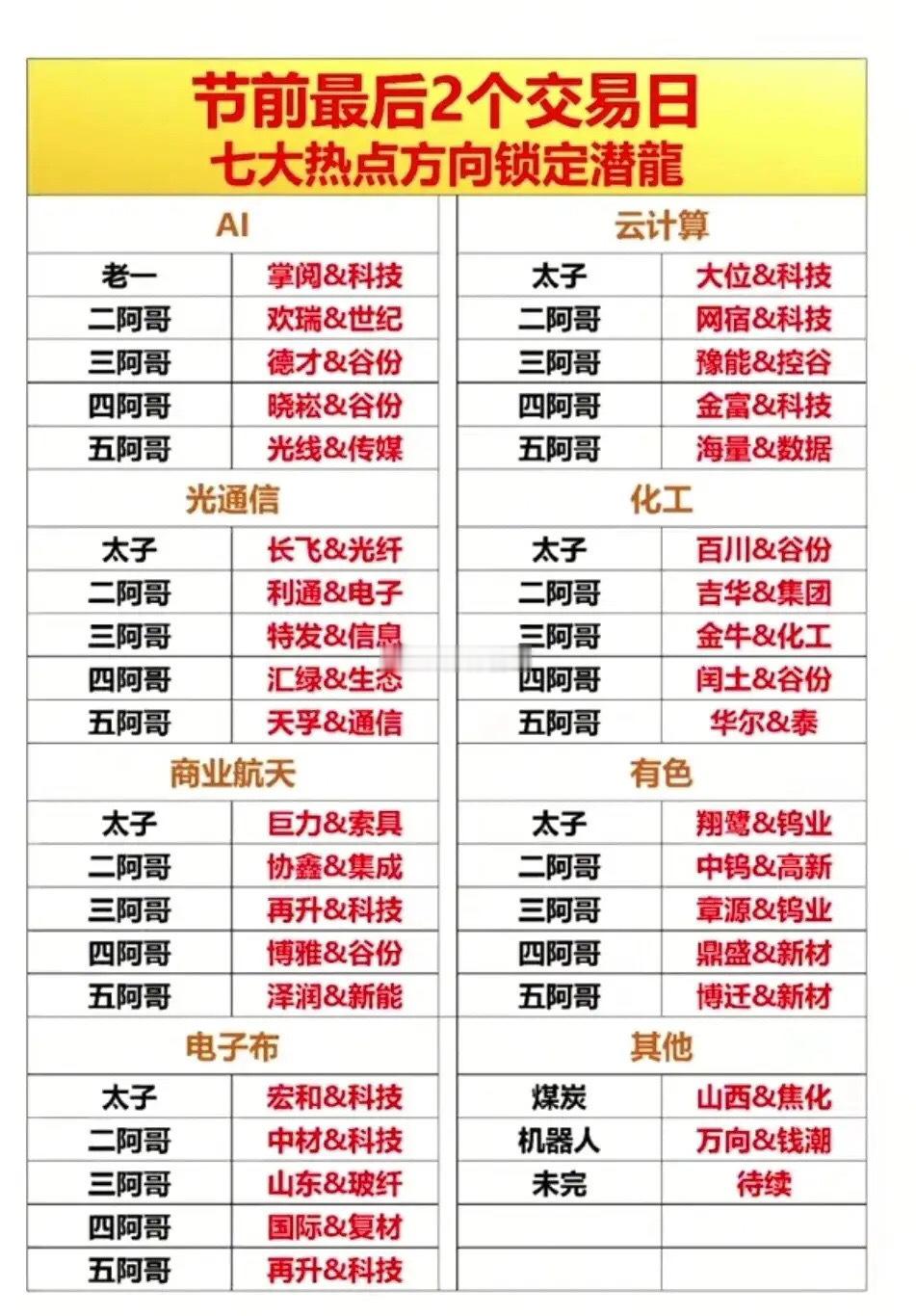 🔥节前最后2个交易日!七大热点方向锁定“潜龙”标的!距离过年只有最后春两个交易日了,市场情绪进入关键窗口,从AI算力到光通信算力底座,从商业航天突破到电子布国产替代,再到化工、有色的周期共振,每一条主线都暗藏跨年行情的“潜龙”标的。这份名单既是市场情绪的晴雨表,也是资金布局的指南针。七大热门题材概念投资逻辑是什么?行业龙头企业有哪些?云计算投资依据:AI算力需求驱动云厂商资本开支高增,IDC、云服务、服务器等环节量价齐升。人气龙头代表大位科技。光通信概念投资依据:光通信是算力网络的“高速公路”,直接受益于AI算力基建与数字经济建设。行业人气龙头代表有长飞光纤。有色金属投资依据:新能源汽车、储能、AI服务器等领域对铜、锂、钨、稀土等金属需求持续增长。行业人气龙头代表中钨高新等等。⚠️ 风险提示:内容仅作科普,不构成投资建议,理财有风险,投资需谨慎。