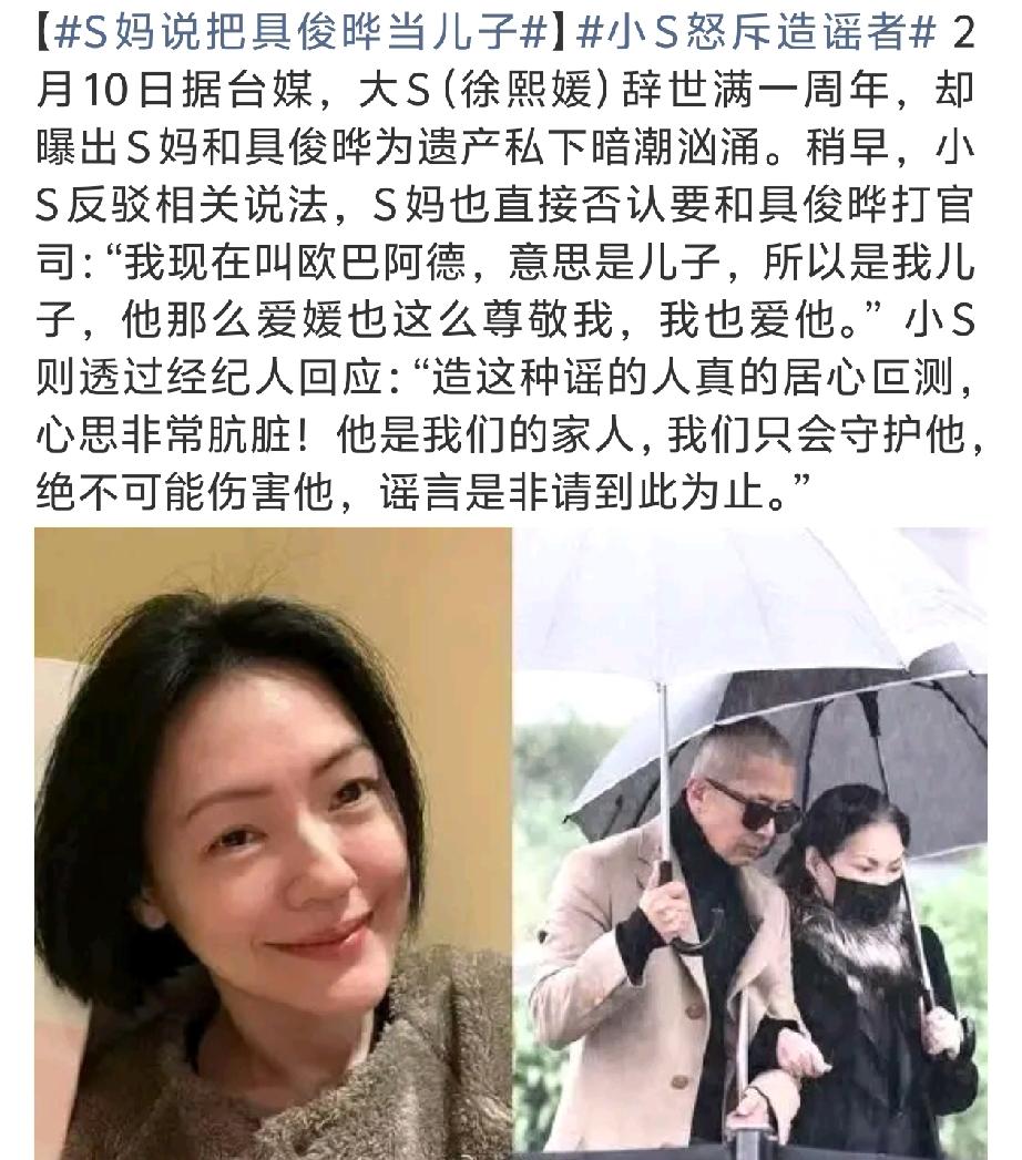 具俊晔绝对是史上最讨丈母娘和小姨子喜欢的男人了吧? 按理说,女儿离世,娘家人最该心疼照料的是她留下的孩子。可S家却把所有的热情和偏爱,都给了这个半路女婿,反而对两个未成年孩子不闻不问。 大S的一周年忌日,具俊晔又是办隆重的雕像揭幕仪式,又是让韩国电视台拍周年特辑,搞得逝者至今还处在舆论风暴中心。 最近质疑声越来越大,S妈和小S先后出来力挺。S妈直言:具俊晔是我的儿子,他爱熙媛,尊敬我,我也爱他。 小S就更不用说了,自从姐姐复合后就跟姐夫关系亲密,姐姐走后每次露面必表白姐夫,还透过经纪人回应:他是家人,会永远守护他。 话说这韩国老头到底有啥魅力?成功让大S的娘家人、朋友,甚至还有粉丝都爱上了他[捂脸]。大S